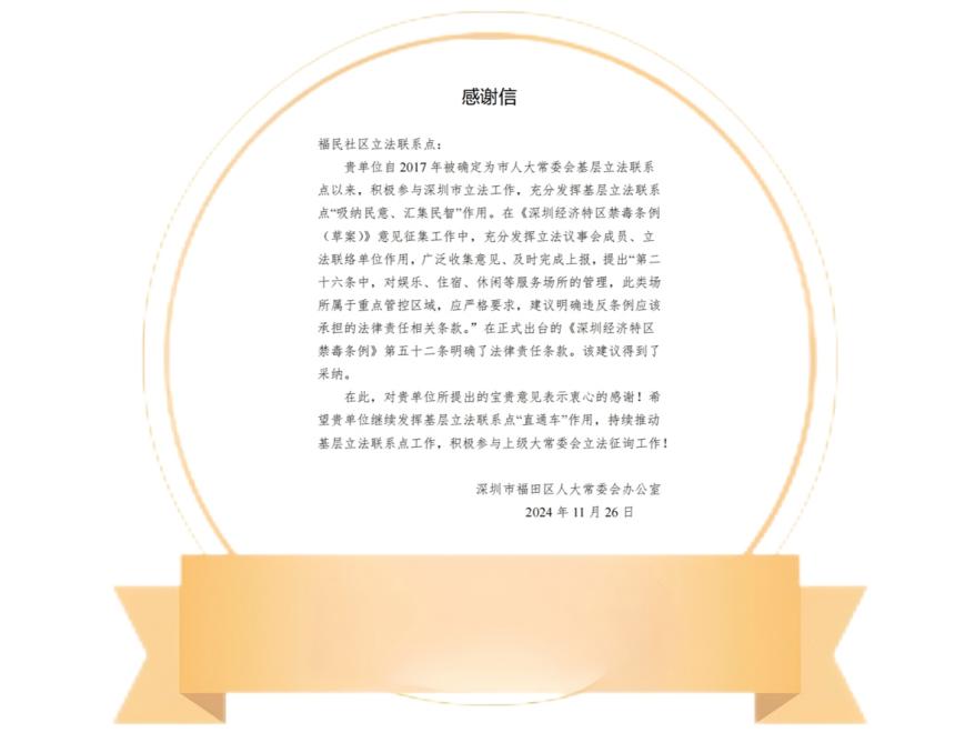 据了解,为了让更多市民广泛参与立法征询、提出更高质量的立法意见,2024年底,福田区人大常委会创新设立基层立法联系点意见采纳反馈激励办法,鼓励对参与提出意见建议的基层单位和个人,以及对提出意见获得采纳的基层单位和个人,通过适当形式予以反馈、鼓励和激励。围绕《禁毒条例(草案)》,福田区人大常委会累计收集梳理17条意见建议上报深圳市人大法工委,其中4条被《深圳经济特区禁毒条例》采纳。福田区人大常委会分别向这4条意见的提出者以及其所在的社区立法联系点发出了采纳证明和感谢信。