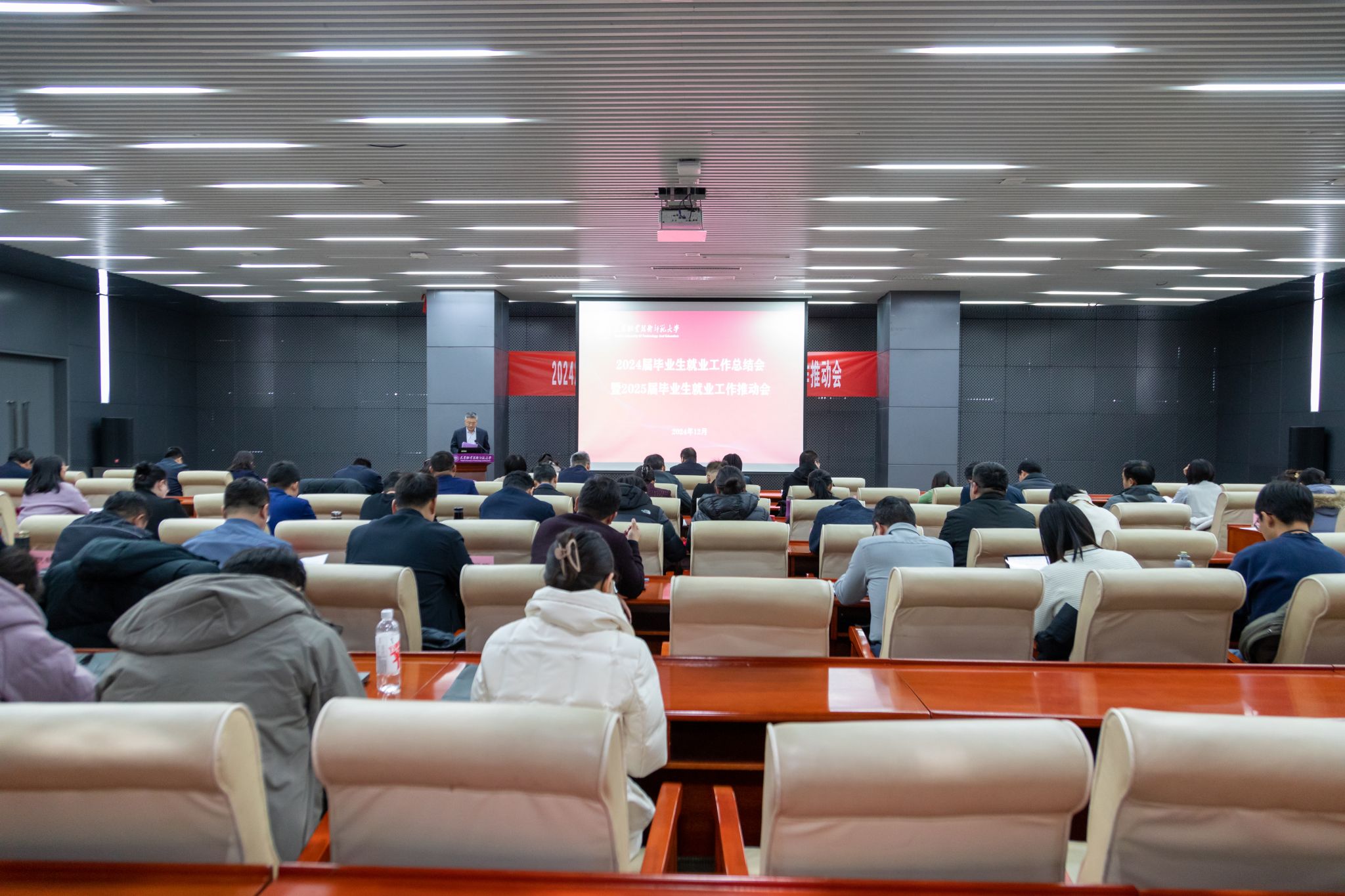 党委办公室、党委组织部、党委宣传部、党委学工部、党委督查室、教务处、研究生处、科研处、人事处、后勤处、团委相关负责同志,各学院、高职部党政主要负责同志、分管学生工作的副书记、毕业班辅导员及就业指导中心全体人员参加了会议。