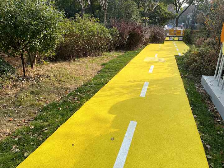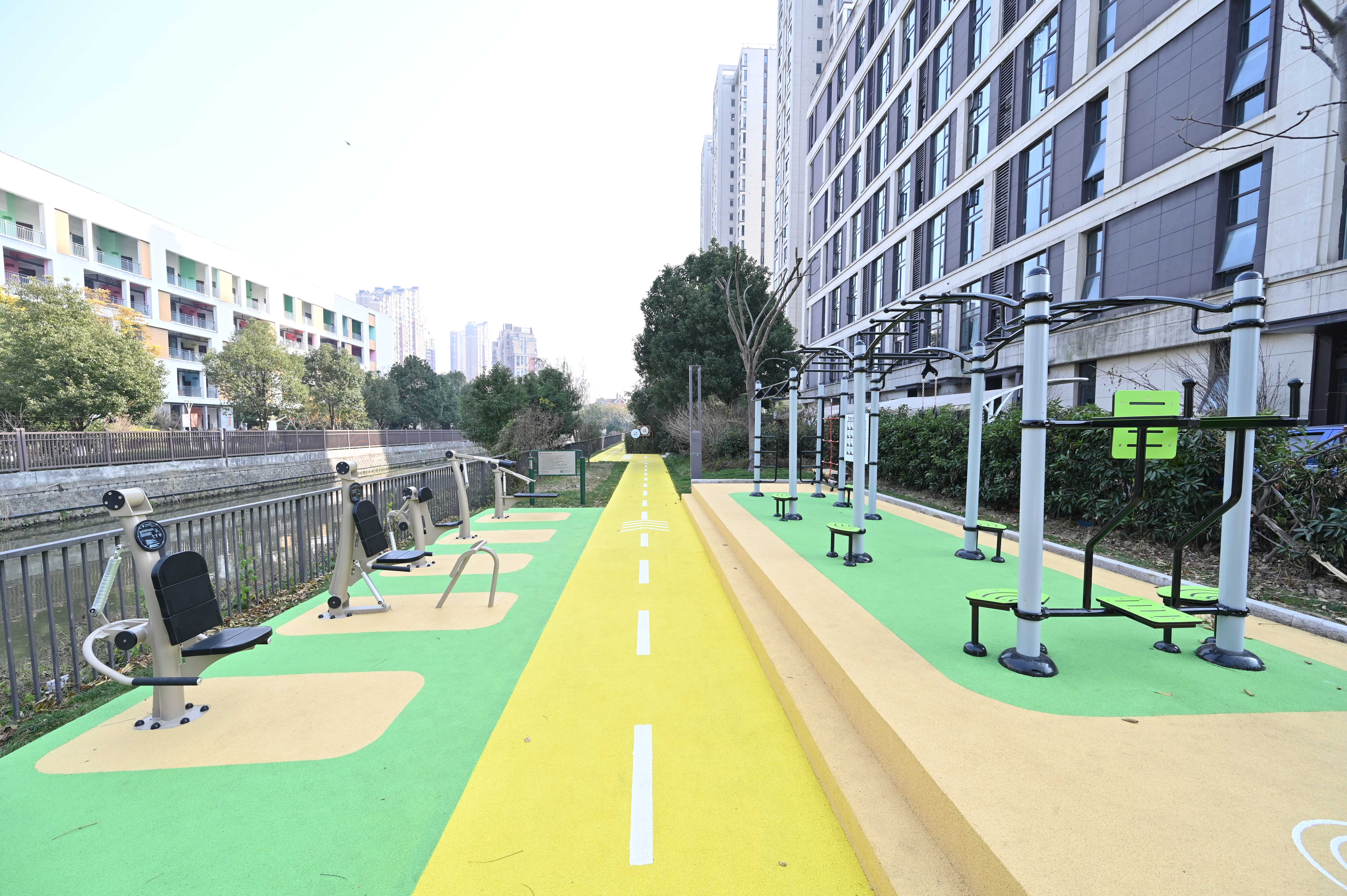 如今这条河边道路摇身一变,焕然一新。记者在现场看到,平整明亮的黄色环保塑胶地面、富有特色的健身步道景观、标识卡路里及跑步米数的白色标识、积极向上的公益宣传,可以说是一步一景。每天都有居民在这里通行,这不仅是一条七彩惠民路,而且是一个体育新空间,每天有老人、孩子在器材上锻炼,为居民打造一个家门口的体育氛围。