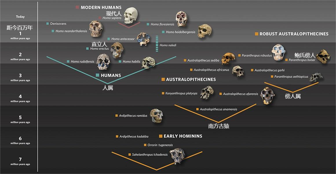 人类化石的时间分布(图片来源:修改自The Natural History Museum, London)