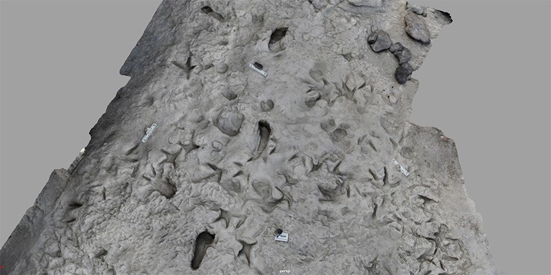 足迹化石的局部三维复原。表面上还分布着大量的鸟类足迹,多数可能由福氏秃鹳(Leptoptilos falconeri)形成。(图片来源:Kevin Hatala/Chatham University)