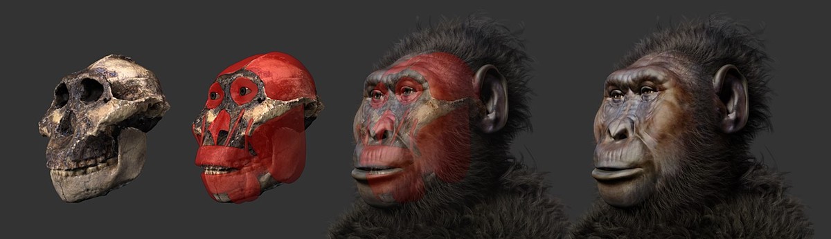 鲍氏傍人的面部复原过程,其头骨形态与现代人差别很大,下颌更大,牙齿粗壮,头骨顶部存在矢状脊(图片来源:维基百科/Cicero Moraes)