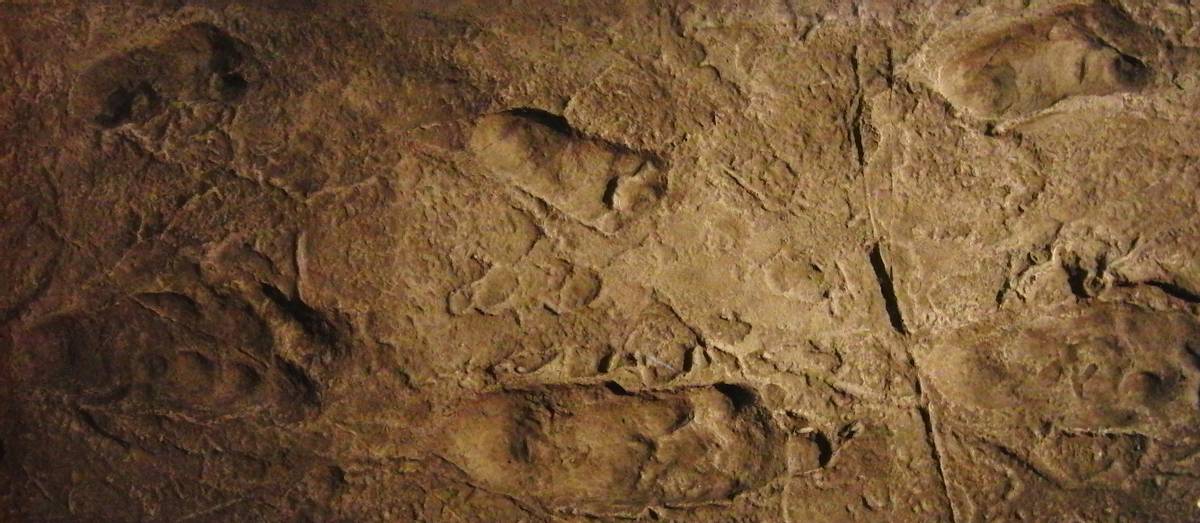 坦桑尼亚莱托利人类足迹化石的复制品。这些足迹目前被认为由南方古猿形成(图片来源:维基百科/Momotarou2012)