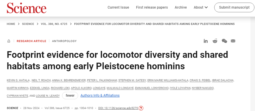 [1] Kevin G. Hatala et al. ,Footprint evidence for locomotor diversity and shared habitats among early Pleistocene hominins.Science386,1004-1010(2024).DOI:10.1126/science.ado5275