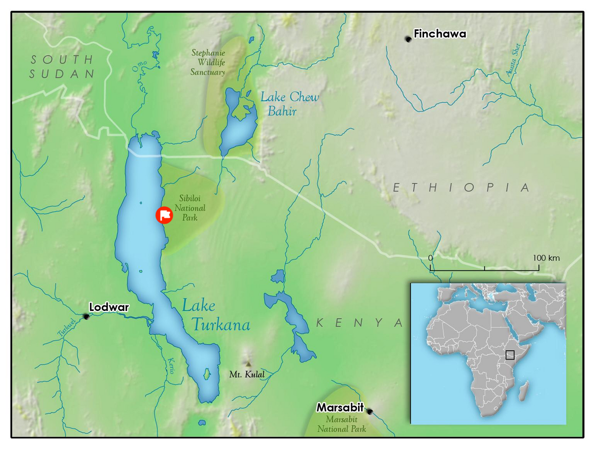 图尔卡纳湖(Lake Turkana)位于图尔卡纳盆地的中心,图中旗帜表示此次化石发现的地点(图片来源:修改自维基百科/Rudyologist)