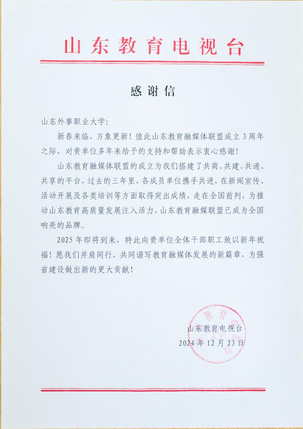 山东外事职业大学自成立以来,通过搭建网站、微信公众号、视频号、抖音及各种新闻平台、视频平台等媒体资源,构建了内外协调、上下贯通、多方联动的融媒体传播矩阵,有效提升了新闻宣传工作的广度、深度和高度。2024年,在山东教育电视台、山东教育网、山东教育新闻网、山东教育新闻联播等平台发布新闻及视频70余篇。山东外事职业大学微信公众号荣获2024“山东教育融媒TOP100优秀教育账号”,运营经验入选《山东教育融媒TOP100优秀教育账号运营经验材料汇编》。并收到了来自山东教育电视台的感谢信,信中写到,对学校的支持和帮助表示衷心的感谢!愿在2025年并肩同行,共同谱写教育融媒体发展的新篇章。