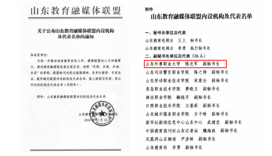 为进一步推动山东省教育宣传工作,推进教育融媒体发展走深走实,近日,山东教育融媒体联盟公布了《关于公布山东教育融媒体联盟内设机构及代表单位名单的通知》。山东外事职业大学成功入选副秘书长单位,学校党委副书记陈光军当选山东教育融媒体联盟副秘书长。