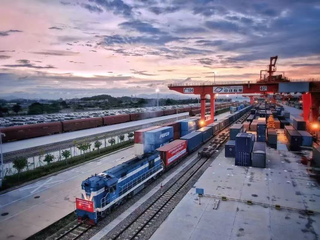 2024年10月16日,中国首趟采用铁公多式联运新模式出口的“中吉乌”国际货物班列从深圳平湖南站缓缓驶出。图源:中国新闻网