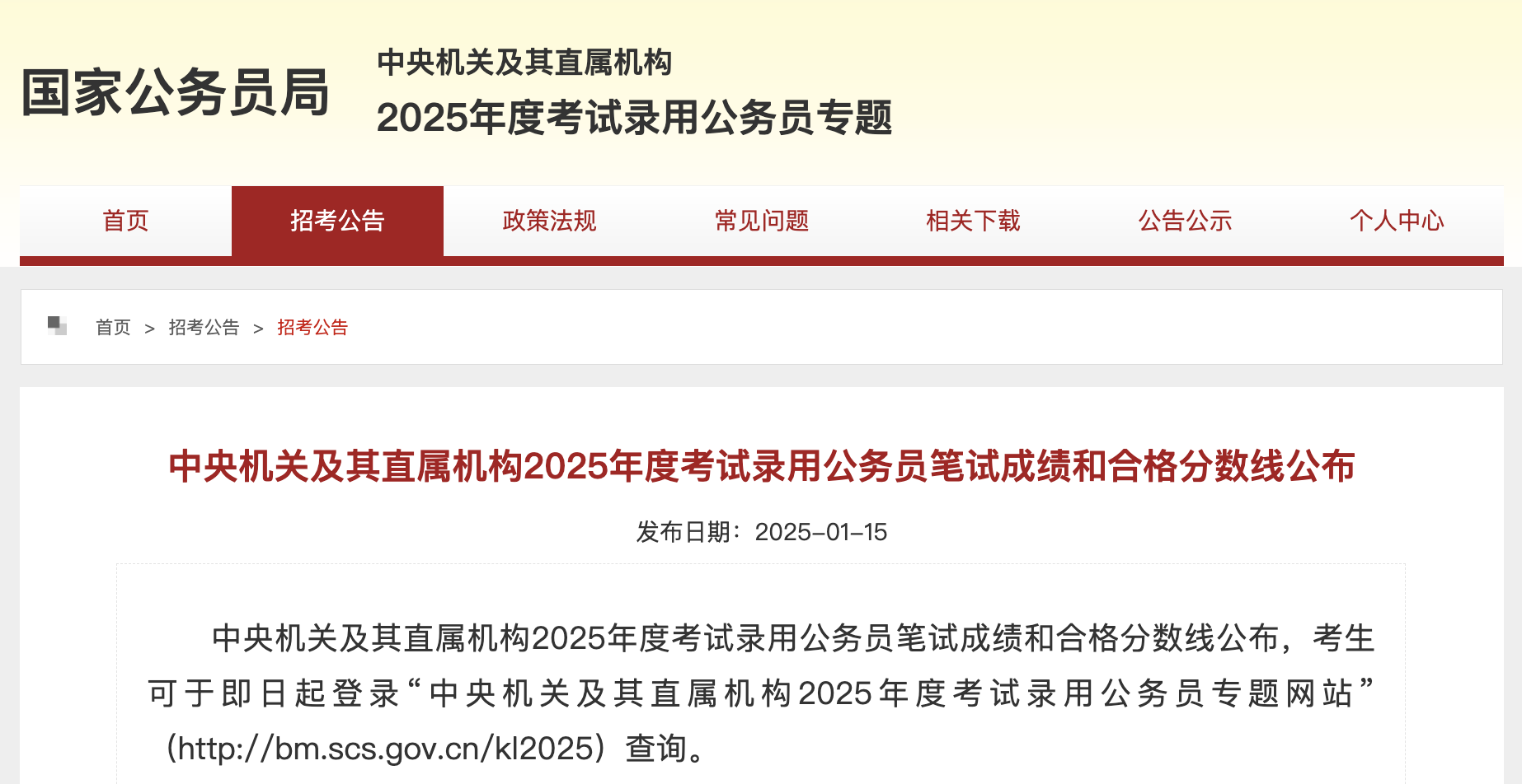 1月15日,中央机关及其直属机构2025年度考试录用公务员笔试成绩和合格分数线公布——