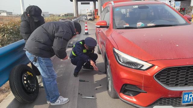 在收费员的引导下,司机先将车辆停在了收费广场安全区域,随后收费班长从便民服务亭拿来修理工具为其更换备用轮胎。十几分钟后备用轮胎更换完毕,班长将最近的修理厂位置告知司机,并提醒司机尽快更换新轮胎,确保行车安全。司机连连道谢:“真是太感谢你们了,回家路上,车坏了我第一时间想到的是修理厂,没想到竟是你们帮我换好的轮胎,谢谢你们。”