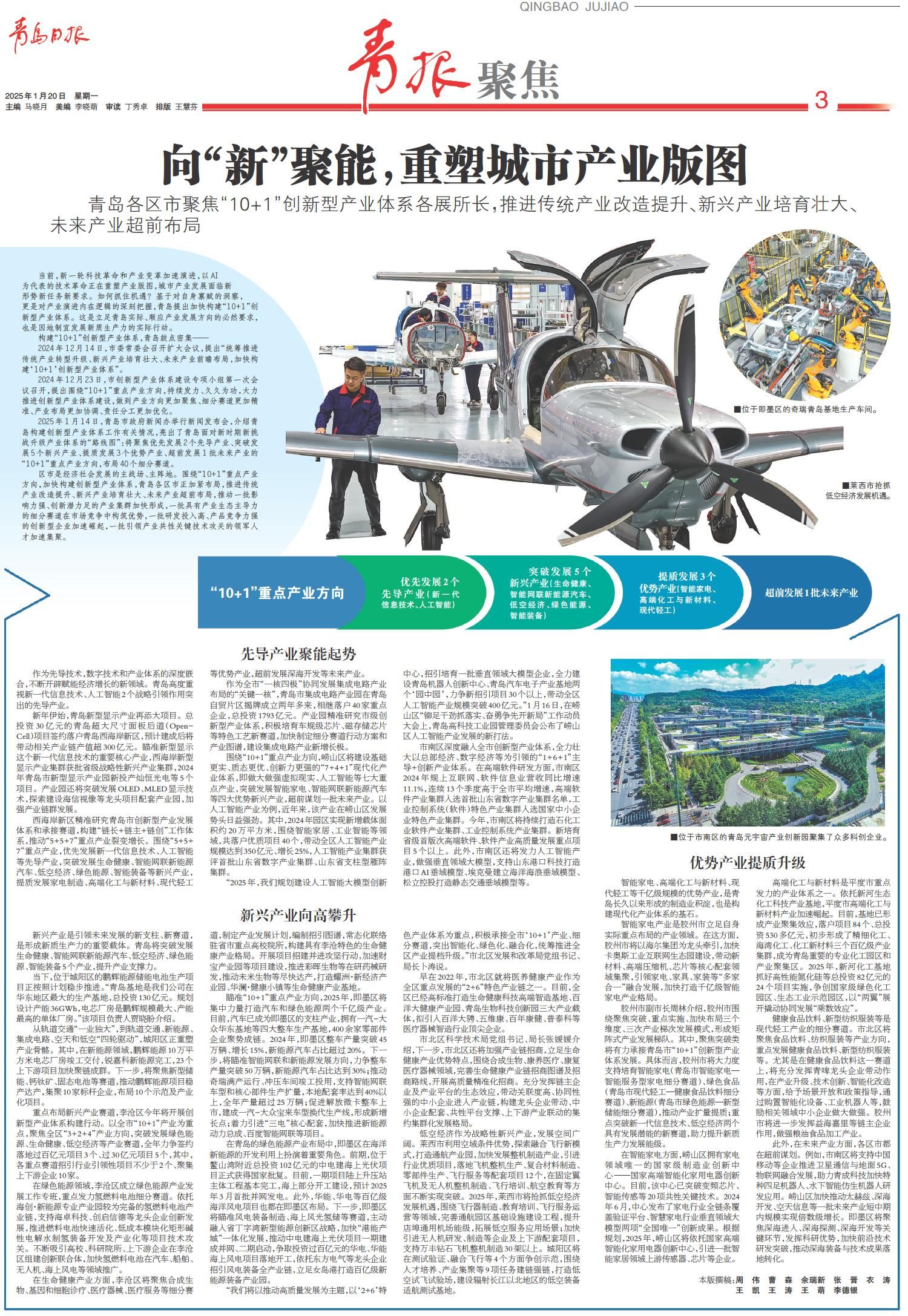 2025年1月14日,青岛市政府新闻办举行新闻发布会,介绍青岛构建创新型产业体系工作有关情况,亮出了青岛面对新时期新挑战升级产业体系的“路线图”:将聚焦优先发展2个先导产业、突破发展5个新兴产业、提质发展3个优势产业、超前发展1批未来产业的“10+1”重点产业方向,布局40个细分赛道。