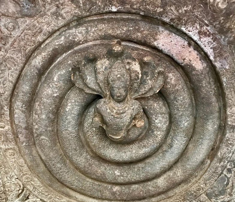 蝰科蛇类大多是伏击型猎手,具有长时间守在一处的特点。而一些眼镜蛇在防御时膨起脖颈、直面侵犯者的行为更让古人留下了深刻印象。因此,这两类蛇(乃至很多其他蛇类)常被刻画为守护者的形象。例如佛教故事中,当佛陀在菩提树下冥想,遭遇暴风雨时,蛇王目支邻陀(Mucalinda,属于娜迦)从树根下爬出,膨起脖颈、以身护着佛陀免于风雨。这样的形象在很多佛教建筑、装饰中都能看到(图11)。