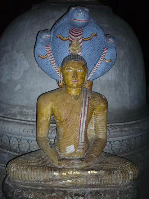 图11 斯里兰卡丹布勒黄金寺中一处雕像,刻画出冥想的佛陀与以身护之的三头蛇图片来源:Henry Lewis