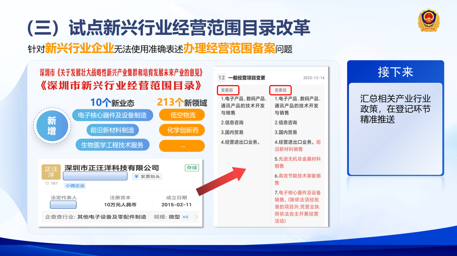 全国首创音视频“双录”电子签名模式,推行无介质网上办理营业执照,预计每年为经营主体减负超5000万元。实现港澳台及外籍人士开办企业全流程网上办理,新增外资企业同比上升18%。全国率先探索拓展经营范围应用,编制出台《深圳市新兴产业经营范围目录》,为新兴行业准入准营提供制度支撑。放宽市场准入24条措施加快落地,深圳电子处方中心平台正式运行。外资准入取得新突破,获批全国首批增值电信业务扩大对外开放试点城市,开展设立外商独资医院试点,引进首个外商独资专科医院项目,落地全省首家中外律师事务所联营办公室——广东知恒律师事务所和美国司莱博律师事务所(前海)联营办公室。