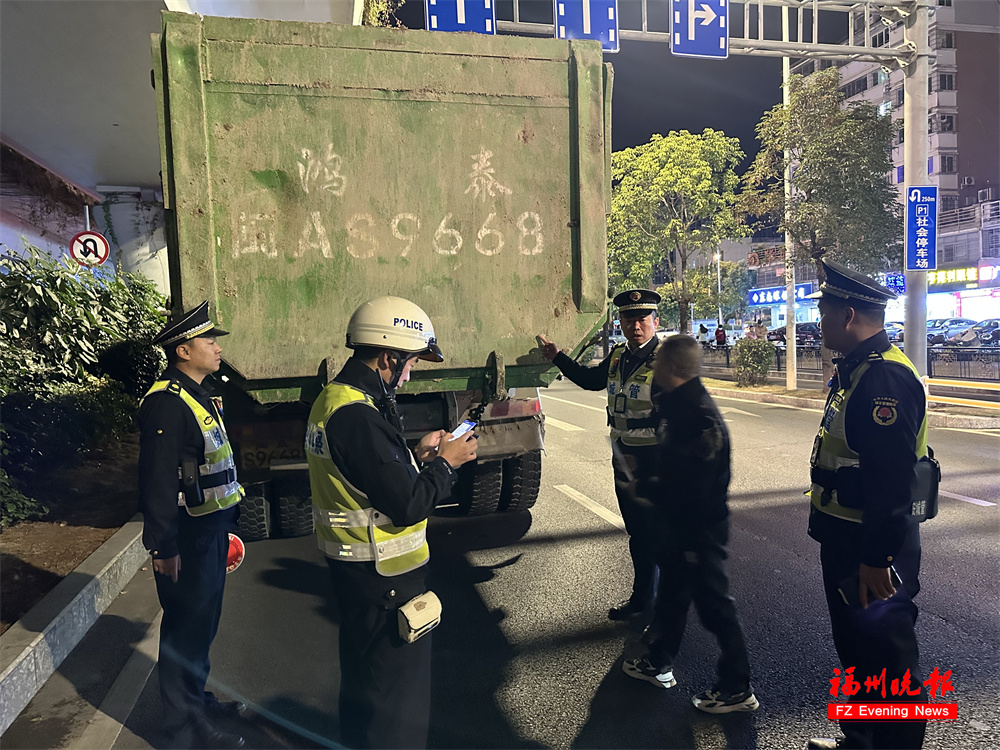 晋安城管联合辖区交警在三环辅道检查渣土运输车。福州市城管委供图