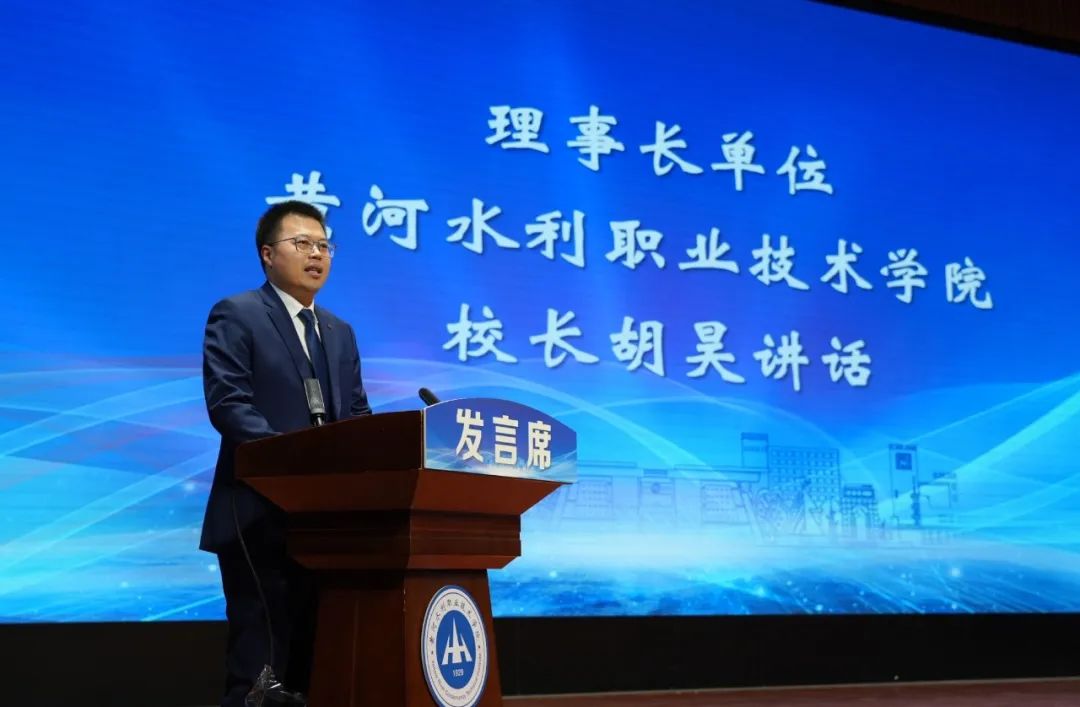 共同体发起单位、坝道医院水利职教总部代表胡昊讲话。他指出,共同体由汇集国内外高端专家团队、企业、科研院所和行业学会优势力量的坝道工程医院、水利类一流本科院校的华北水利水电大学、全国“双高计划”A档建设单位的黄河水利职业技术学院共同发起,实现了强强联合。坝道工程医院水利职教总部的成立将充分发挥坝道工程医院在行业中的领航与示范作用,水利职教分院间将开展更广泛的合作、更多元的对接、更深层的协同,实现多方资源优化配置与高效利用。共同体的成立和水利职教总部的揭牌标志着我们在探索产教融合新模式、推动水利职业教育高质量发展的道路上又迈出了坚实的一步,将推动校企、校际深度协同,加快教育链、人才链与产业链、创新链的有效衔接,促进产教融合、科教融汇,促进水利新质生产力发展。
