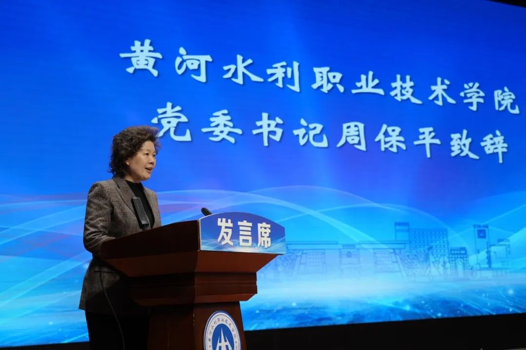 黄河水利职业技术学院党委书记周保平致辞。她简要介绍了学校的办学历史、办学特色和育人成效,特别是水利类专业建设成果。她指出,党的十八大以来,以习近平同志为核心的党中央高度重视水利事业高质量发展工作,将除水害、兴水利作为保障经济社会高质量发展的基础性、战略性工作常抓不懈。智慧水利和水灾害防治则是现代水利事业发展的重要战略方向,统筹智慧水利和水灾害防治,是推动水利行业数字化转型和创新发展,提高水利管理和防灾减灾的科学化、智能化水平,加快实现水利现代化的必由之路,对服务国家江河战略、构建人水和谐的生态文明社会具有深远影响。她表示,作为共同体发起单位之一,黄河水利职业技术学院一定会珍惜机会,不负众望,不辱使命,充分发挥牵头单位的主导、带动、协调、示范、辐射作用,本着“共同建设、共同管理、共享成果、共担风险”的原则,与各成员单位紧密合作、资源共享,打造水利行业产教融合共同体的典范,为水利行业的高质量发展做出更大的贡献。