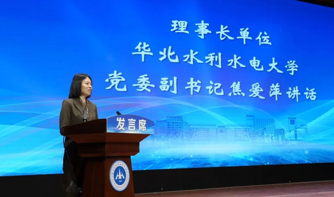 共同体发起单位代表焦爱萍讲话。她表示,华北水利水电大学将充分发挥自身在水利类专业上的科研优势,紧密围绕黄河流域生态保护和高质量发展重大国家战略,通过产教融合共同体,整合各方资源,聚焦智慧水利、水灾害防治等重点领域开展科技攻关,为国家战略实施提供更有力的支撑。她强调,智慧水利和水灾害防治是一项系统工程,需要共同体单位共同努力、携手并进,为实现水资源的可持续利用和水安全保障贡献智慧和力量。