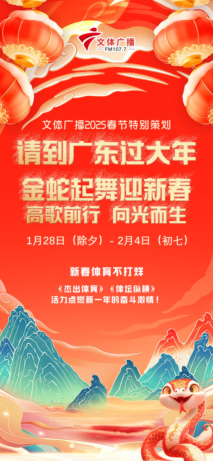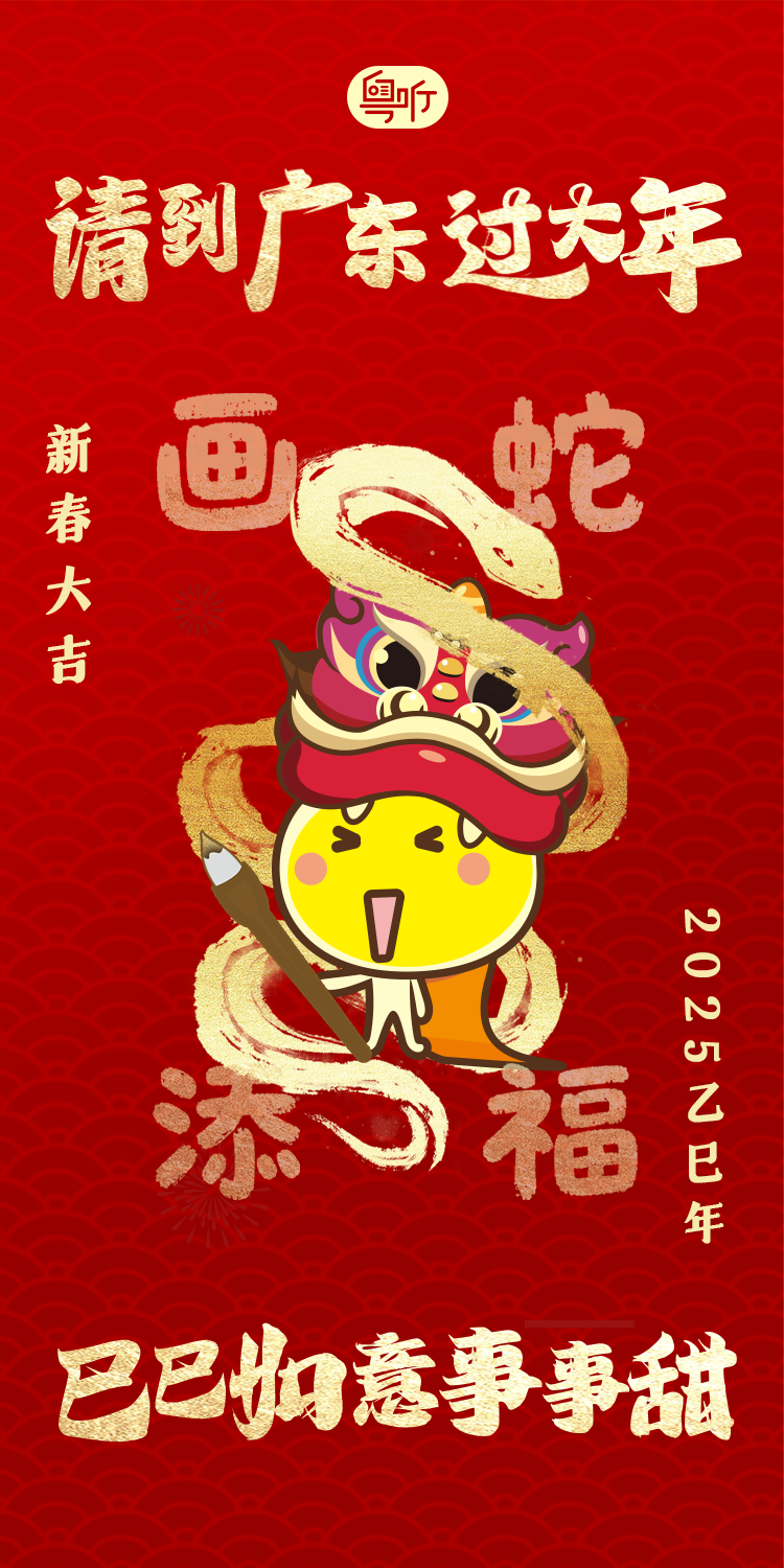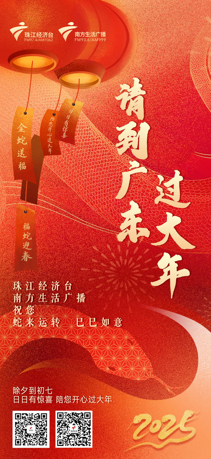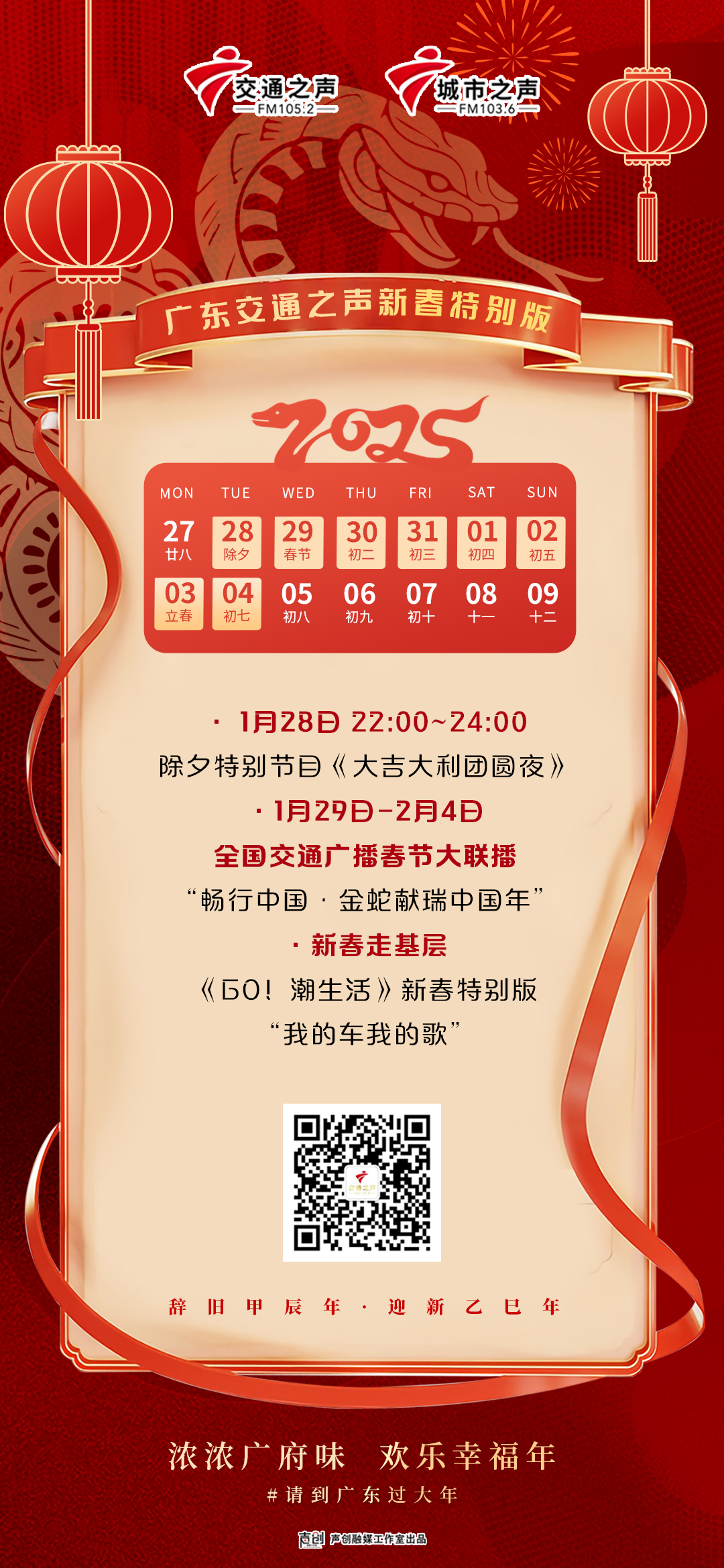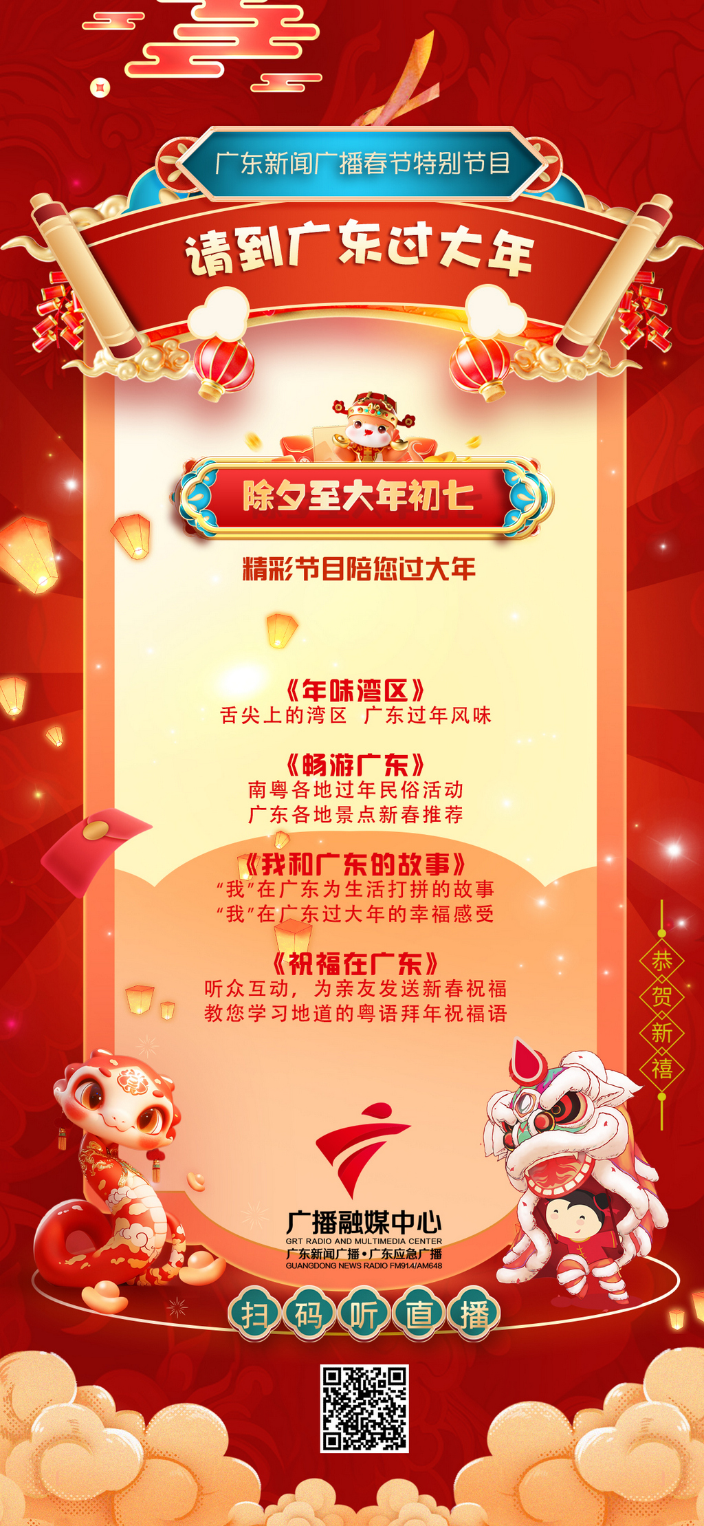 在这辞旧迎新的美好时刻,广东广播电视台推出广播板块春节特别节目,愿我们在蛇年里,如灵蛇般灵活聪慧,抓住每个机遇;如祥蛇般福气满满,收获美好和幸福;如金蛇般闪耀光芒,创造新一年的辉煌。