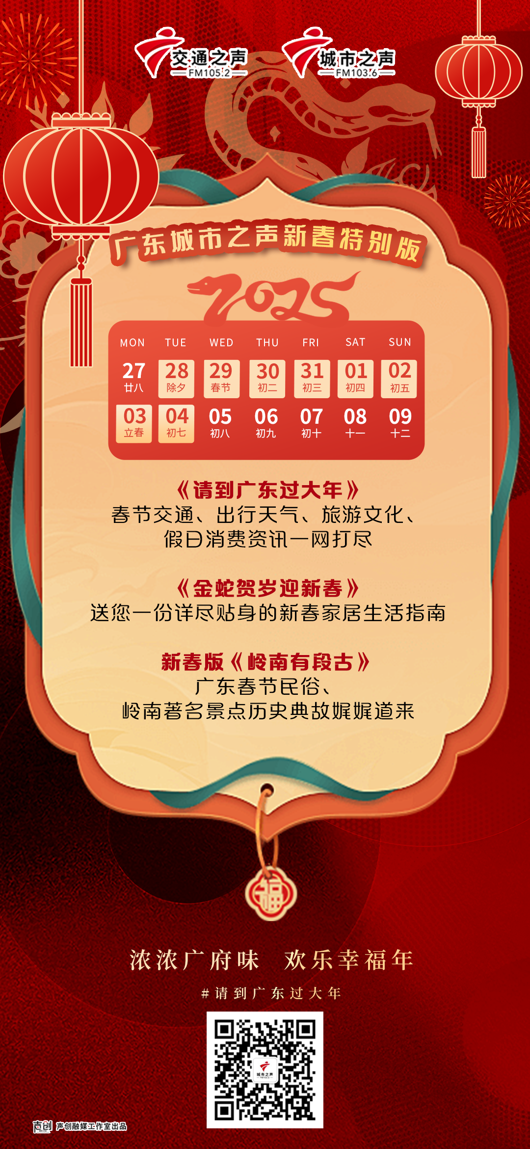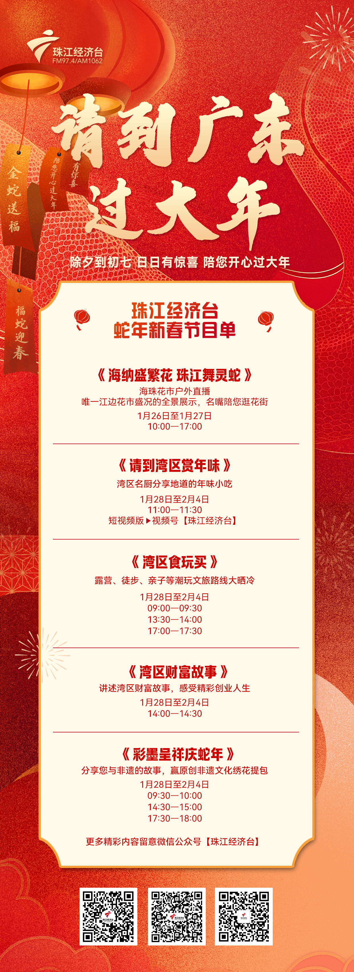 新春特别节目《金蛇起舞迎新春,请到广东过大年》,主持人与听众实时互动,乘着大气电波畅游湾区,感受蛇年新春各地的民风民俗和喜庆活动,热热闹闹过大年。作为“申遗成功”的首个春节假期,新媒体端还将带大家开启“非遗年味游”,穿梭于城市与乡村,感受特有的“广东式浪漫”。