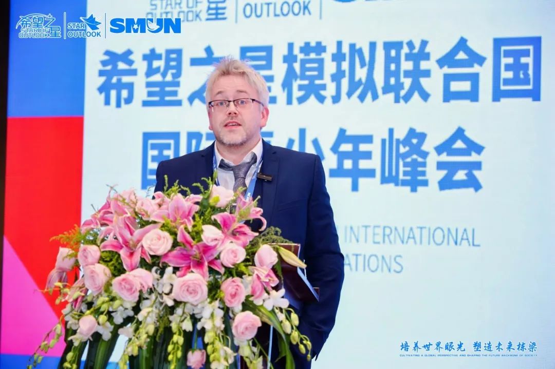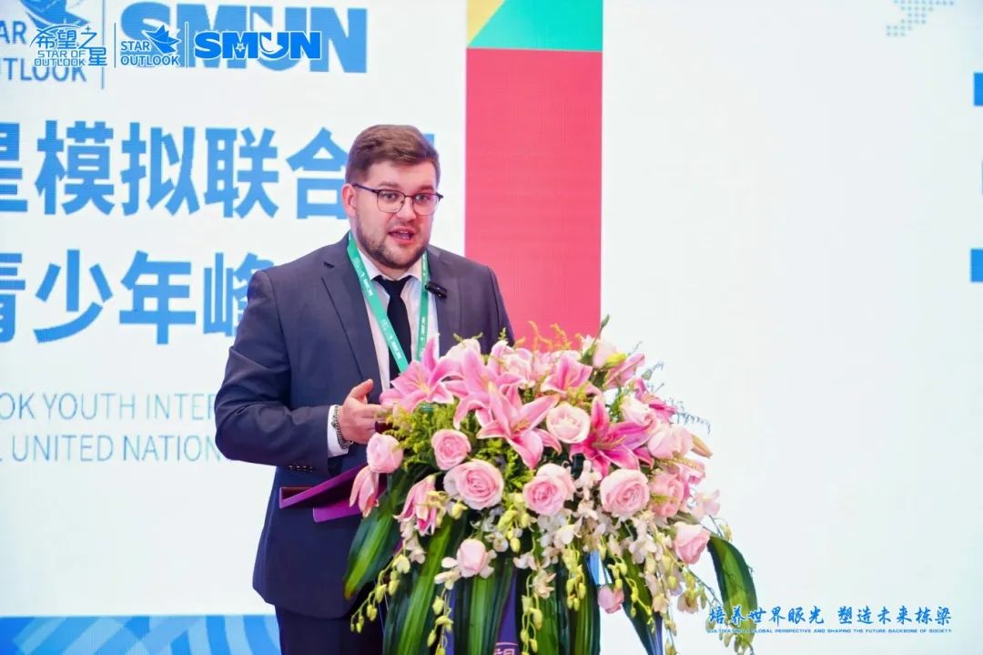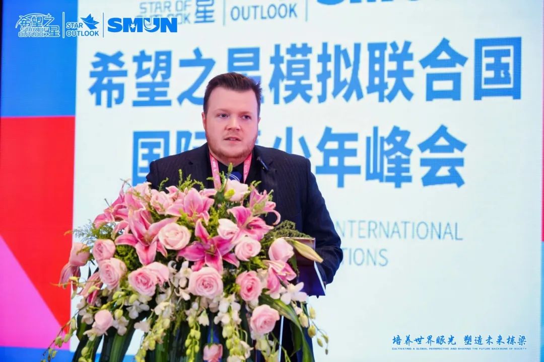 刘彦均作为学生代表分享了自己从参加“希望之星”到晋级“全国十强”的心路历程。以及在会前准备中,感受到作为国家代表应该有的责任和担当。这种责任,是要对一个国家的发展挺起肩膀;这种担当,是要对人类的命运挺起脊梁。同时,刘彦均也深切的感受到作为中国公民的幸福——因为祖国的强大,才有机会参与到“模拟联合国”活动。