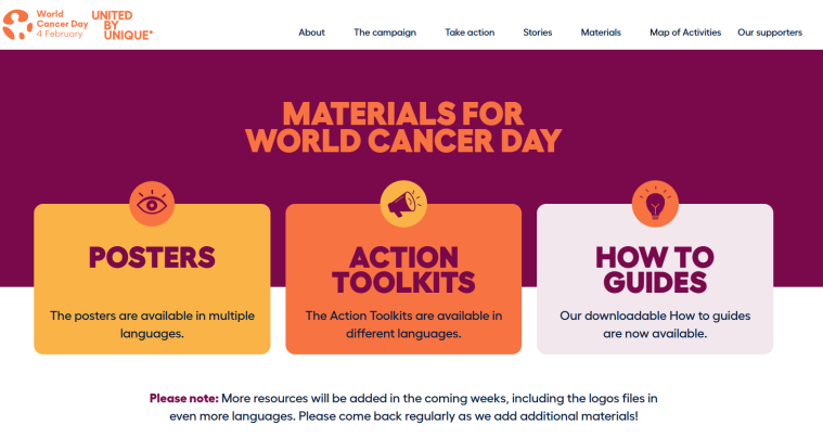 2024年11月4日国际抗癌联盟(UICC)发起了 2025-2027 年世界癌症日的新活动,主题是“United by Unique”(因独特而团结),呼吁以人为本的护理,将个人而不是疾病置于医疗保健决策的中心。2025年2月4日是第二十六个“世界癌症日”,旨在提高人们对癌症患者独特需求的认识,团结一致,以最适合他们的方式管理癌症。