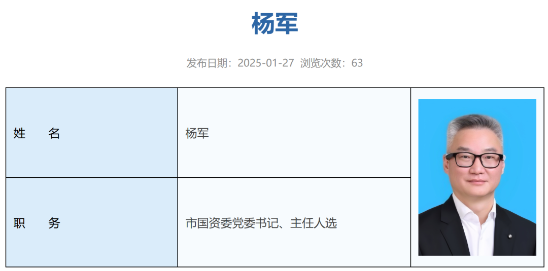 日前,深圳市人民政府国有资产监督管理委员会官网机构领导一栏发布更新,显示杨军已担任深圳市人民政府国有资产监督管理委员会党委书记、主任人选。