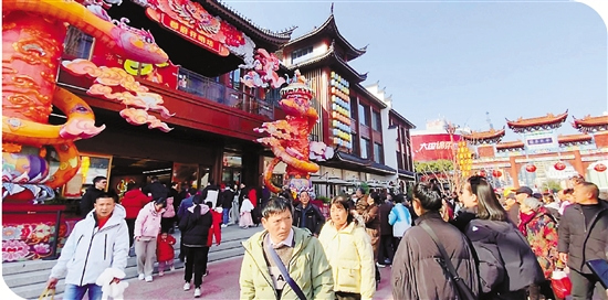 2月2日,正月初五,宁波城隍庙文旅街区上演国潮民乐表演,身着古装的演员弹奏古筝、琵琶,《青花瓷》《春江花月夜》等乐曲乐声悠扬,吸引游客驻足欣赏。新春假期,焕新亮相后的城隍庙成为消费新场景,日均吸引游客8万余人,同比增长近3倍。