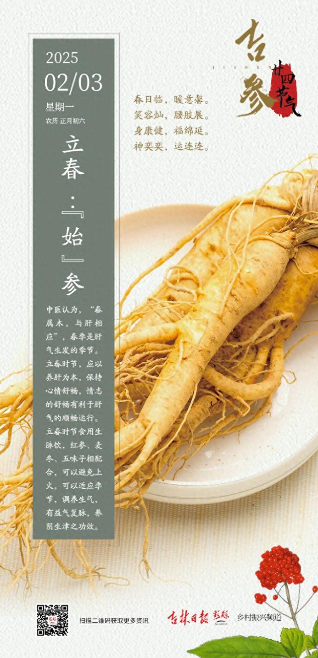 中医认为,“春属木,与肝相应”,春季是肝气生发的季节。立春时节,应以养肝为本,保持心情舒畅,情志的舒畅有利于肝气的顺畅运行。立春时节食用生脉饮,红参、麦冬、五味子相配合,可以避免上火,可以适应季节,调养生气,有益气复脉,养阴生津之功效。