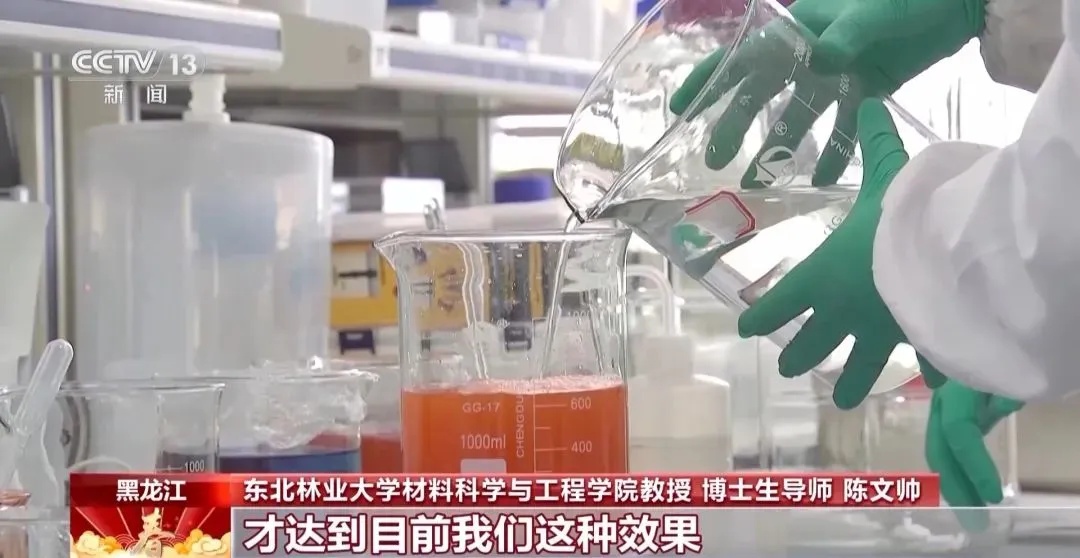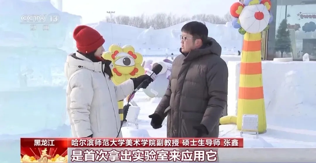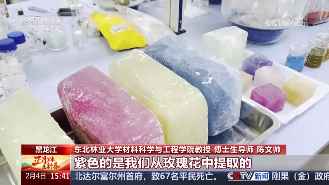 东北林业大学材料科学与工程学院教授、博士生导师陈文帅:我们加入一些环境友好型的、植物级的分子,帮助这些色素在冰中非常好地分散,才达到目前我们这种效果。整个过程体系是绿色的、可持续的,这是我们一个最核心的理念,我们开发的这些试剂是环境友好的,当春暖花开的时候冰融化掉,它会变成营养物质沉积到土壤里,滋生花草的生长。