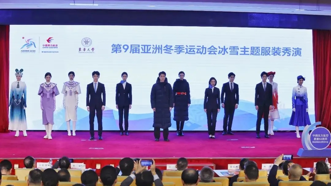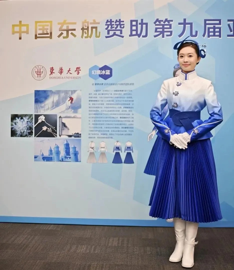 东华大学携手中国东方航空打造亚冬会“幻境冰蓝”主题颁奖礼服,亚奥理事会官员、赛会技术官员的多款正装和丝巾领带配饰等。