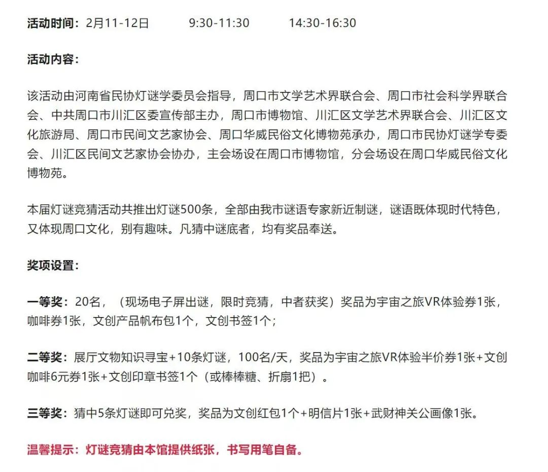2月11日至12日,周口市博物馆将联合周口华威民俗文化博物苑举办2025年“弘周礼”第十届元宵节灯谜竞猜活动。