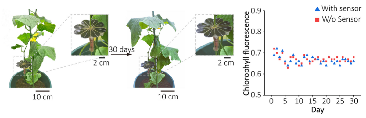 研究者将该可穿戴设备安装在南瓜茎部,经过30天的“佩戴”,其生长没有出现明显的负面影响,并且叶片的叶绿素活性也没有明显变化。