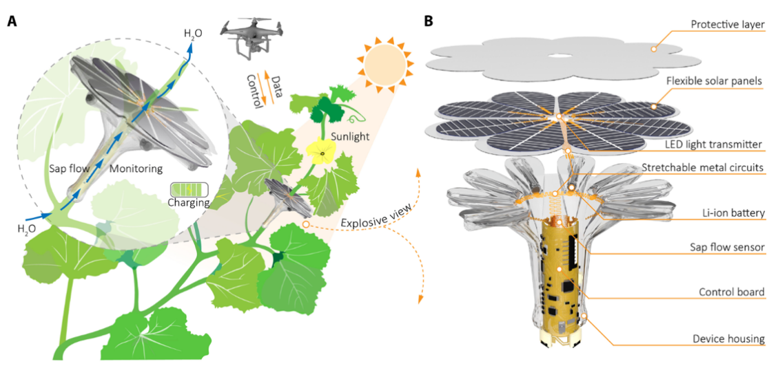 植物的“汁液”与动物的血液类似,源源不断地为植物的生长提供水分和营养物质,具有重要的研究价值。2024年12月4日,中国科学家研制了一种形似“太阳花”的设备,并且成功将其“穿”在植物的茎秆上,实现了植物汁液茎流速度的监测和数据的传输,相关成果发表于《Science Advances》杂志。
