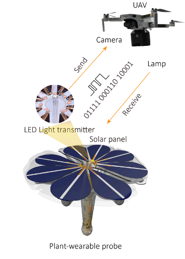 为了实现可穿戴设备电能的自己自足,研究者受萤火虫信号行为的启发,开发了一种耗能小、传输高效的光通信系统。该通信系统以集成在太阳能电池板中的小型LED为信号源,通过对LED发射器的编程,实现植物汁液流动方向和速度的编码。最后,利用无人机等具有拍摄功能的设备对LED的闪烁时间和频率进行捕获,实现植物汁液流动信息的记录。