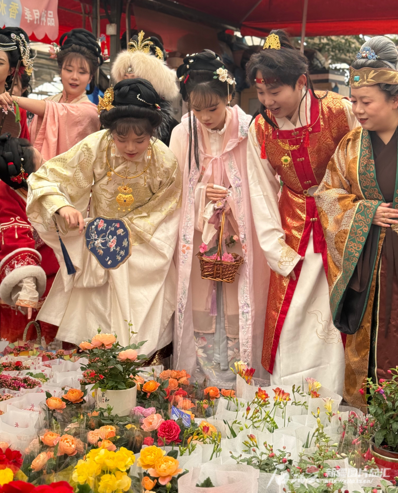 天山网/新疆日报讯(记者 孙芳婷报道)2月12日,乌鲁木齐市南昌路的新疆明珠花卉市场人流涌动,随着电视剧《红楼梦》的插曲悠悠响起,一场跨越时空的文化盛宴在花香中徐徐展开。大观园中的“贾母”携“贾宝玉”和金陵十二钗款款而来,扮演者们身着华丽精致的古装,轻摇纨扇穿过垂丝海棠花廊,鬓边点翠步摇轻颤,引得市民举着手机快步簇拥而上。
