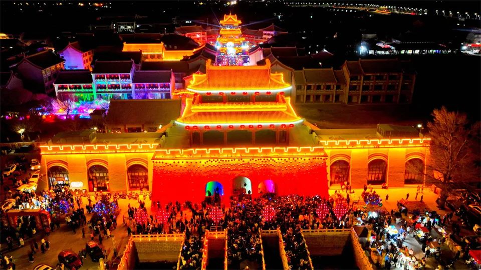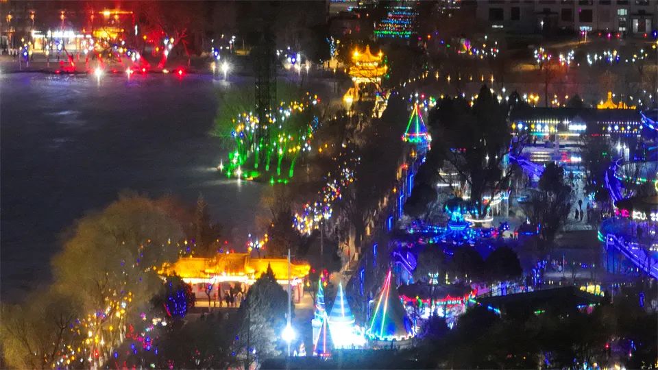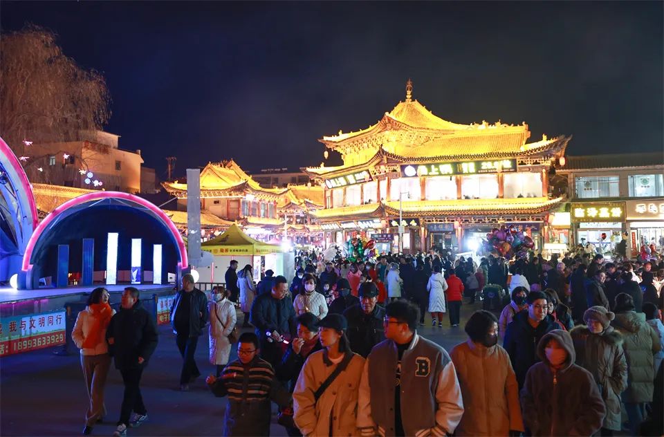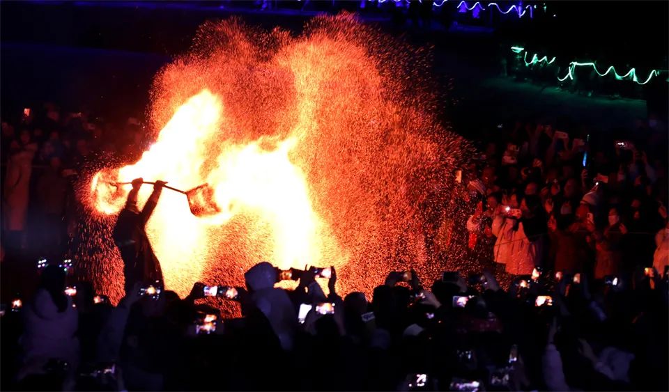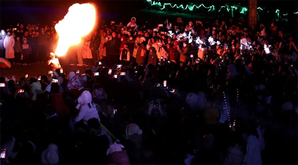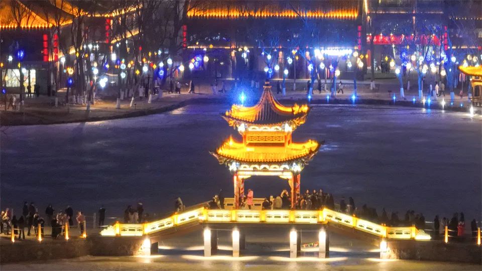 甘州府城内,灯火辉煌、游人如织,人们看花灯、观冰雕,欣赏非遗代表性传承人打铁花表演,参与多彩的民俗活动、品尝地道美食,共同欢庆元宵佳节。