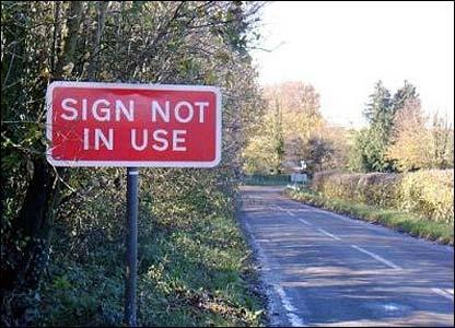 再举一个真实的例子:下方这个牌子,虽然上面写着“路标不在使用中”,但实际上却立在路边履行职责,导致矛盾又出现了。