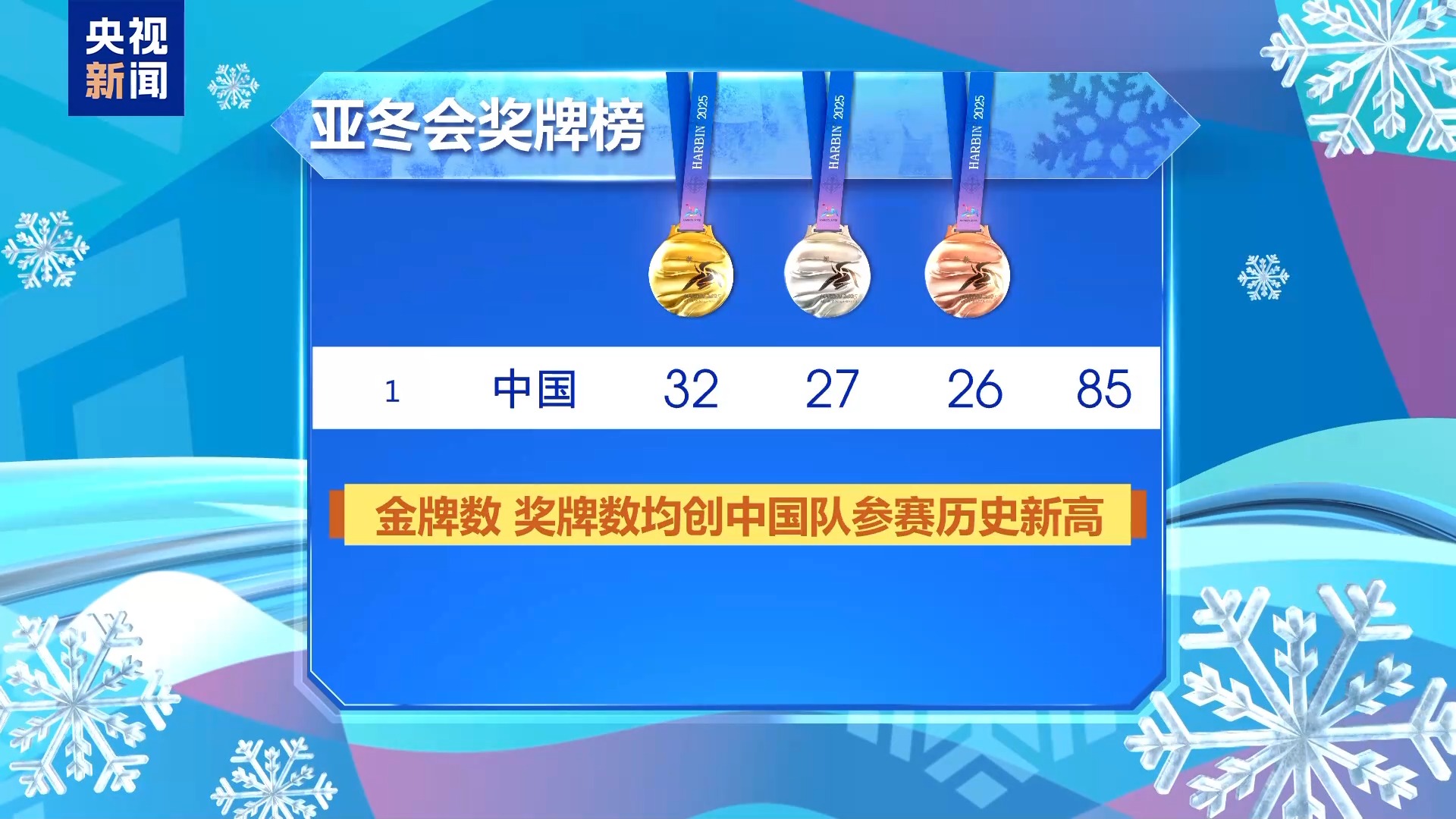 在本届亚冬会上,中国队不仅牢牢位居金牌榜、奖牌榜双榜榜首,金牌数、奖牌数也均创中国队参加亚冬会比赛以来历史最好成绩,续写了中国冰雪运动新的篇章。