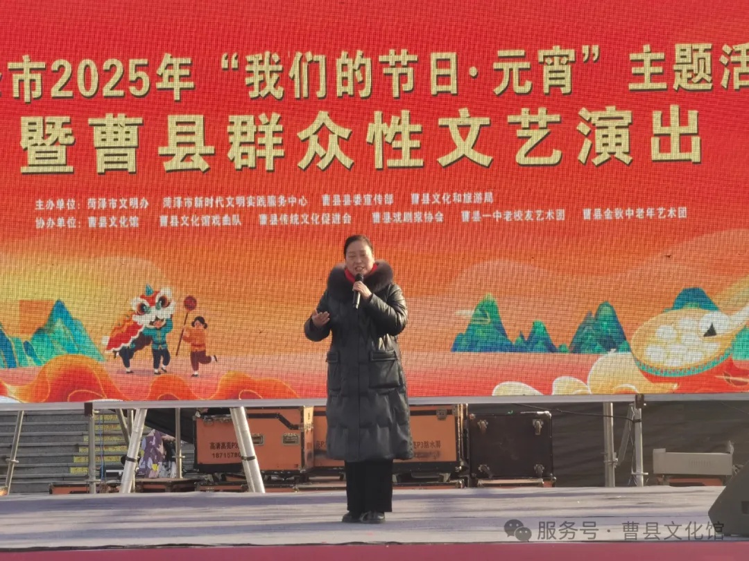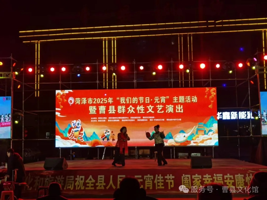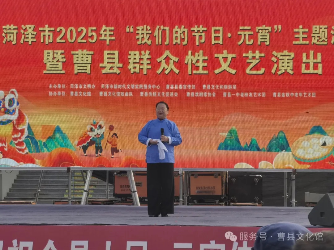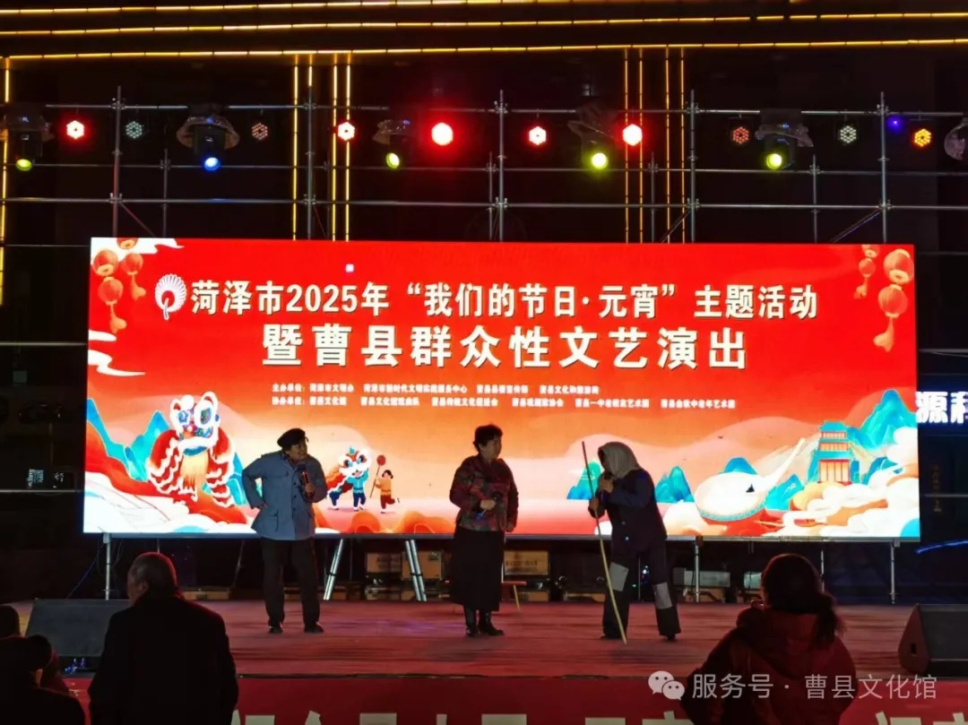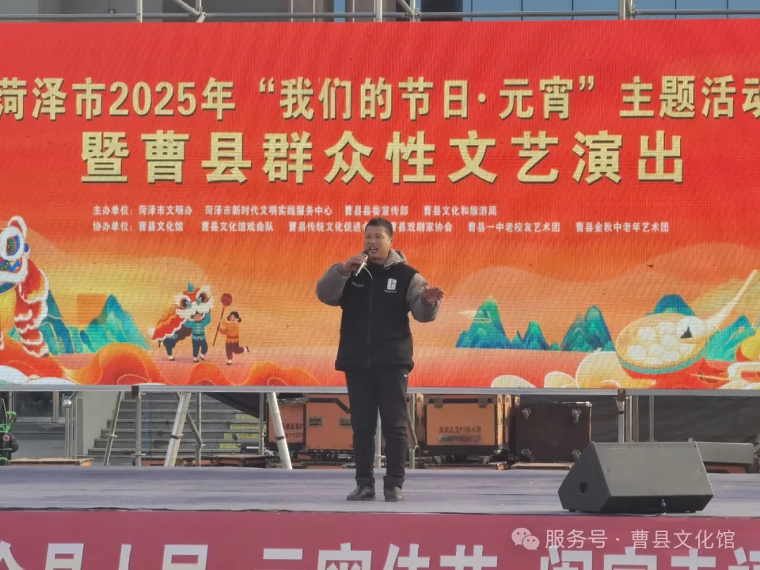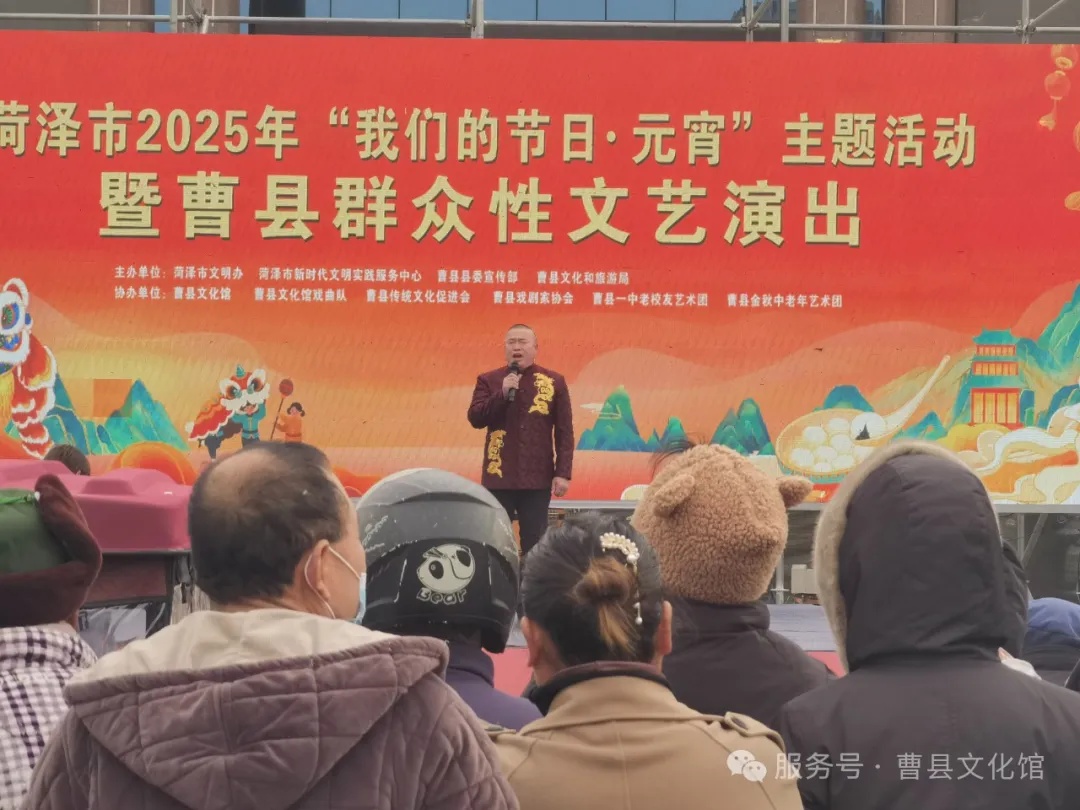 为了丰富群众的精神文化生活,营造喜庆祥和的节日氛围,2月11日至2月13日(农历正月十四至正月十六),由菏泽市文明办、菏泽市新时代文明实践服务中心、曹县县委宣传部、曹县文化和旅游局主办,曹县文化馆承办,曹县文化馆戏曲队、曹县戏剧家协会、曹县传统文化促进会、曹县一中老校友艺术团、曹县金秋中老年艺术团协办的2025年“我们的节日—元宵节”群众性艺术展演活动,在曹县南湖人民广场成功举办。