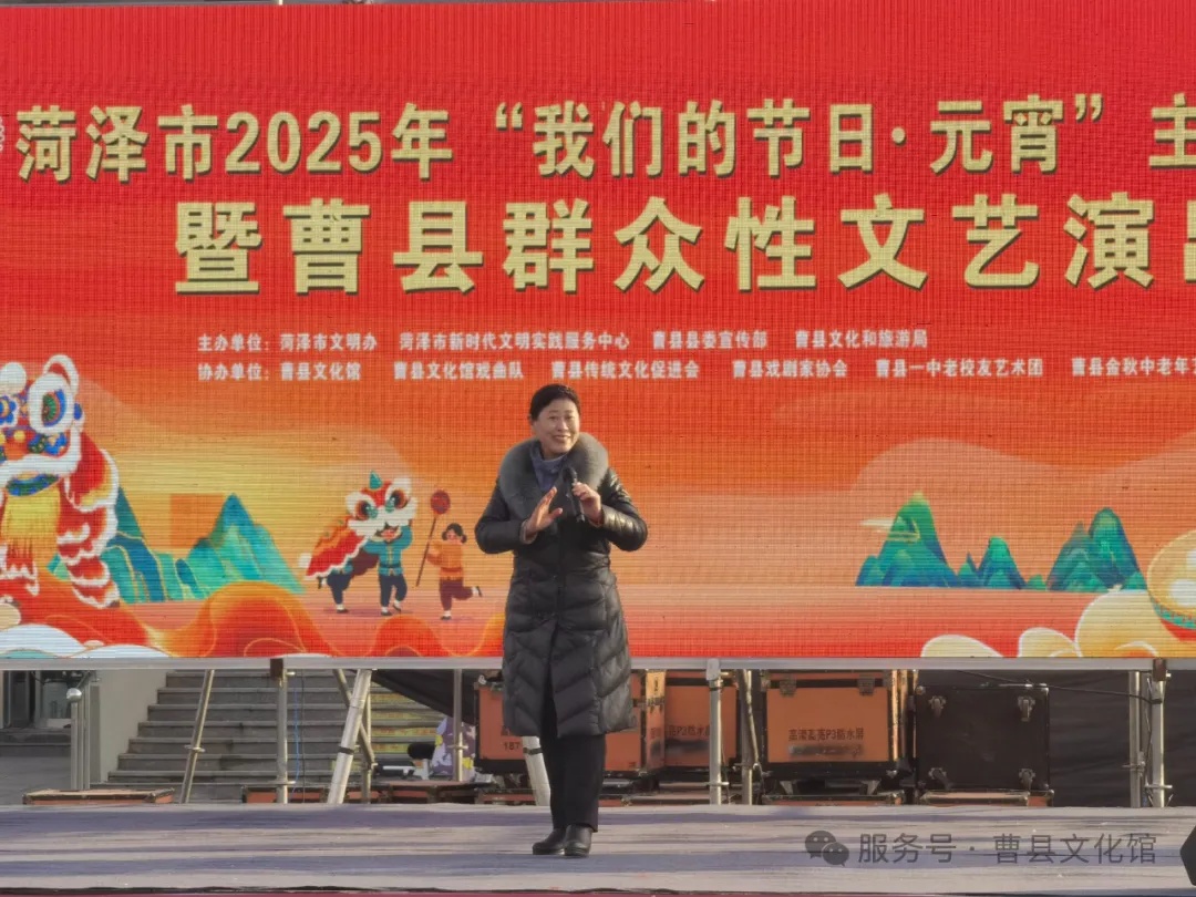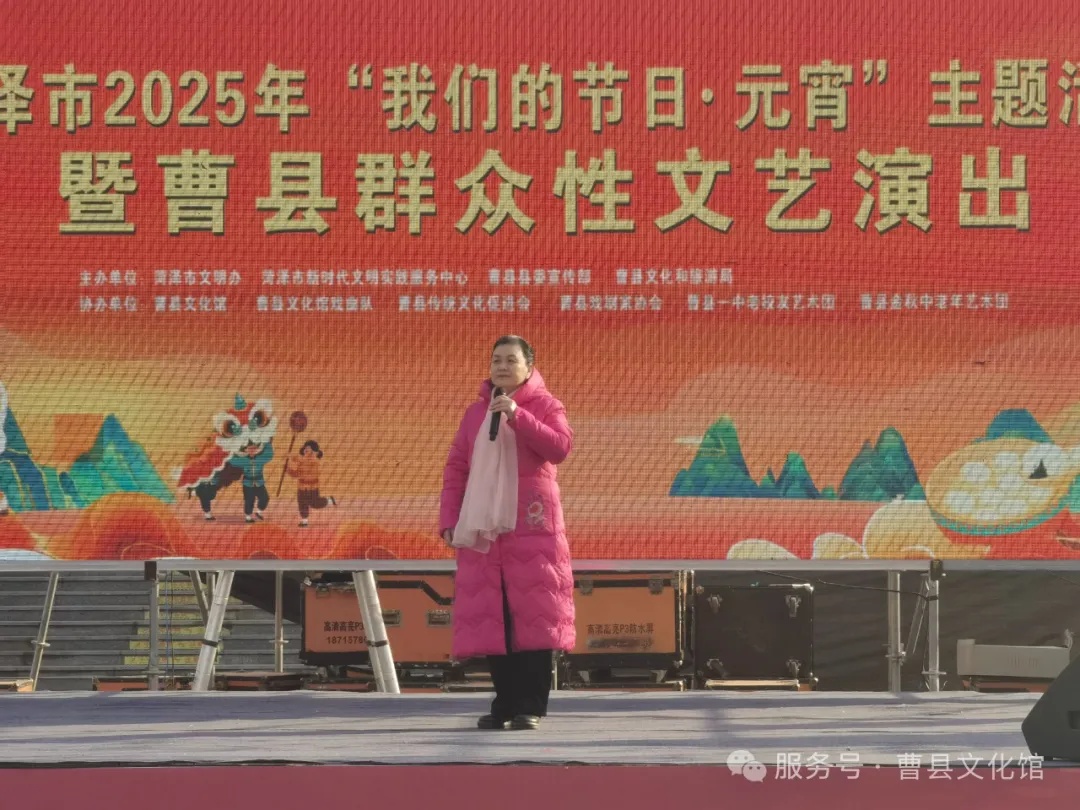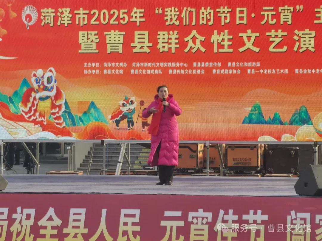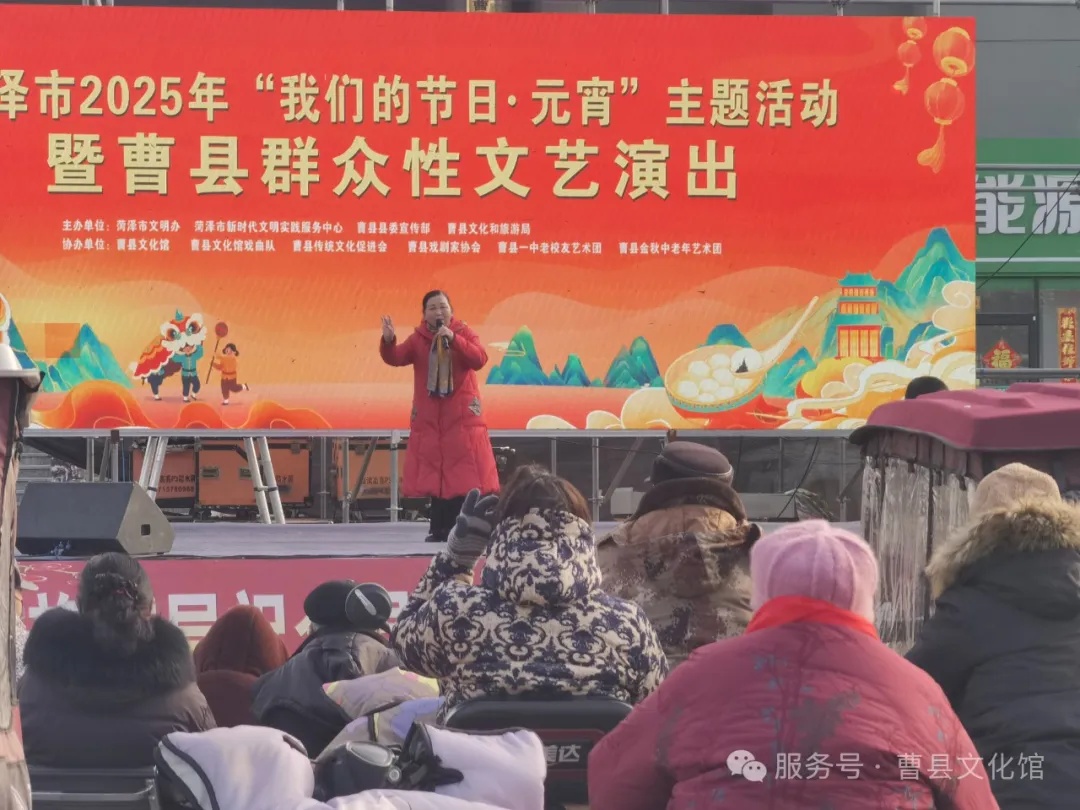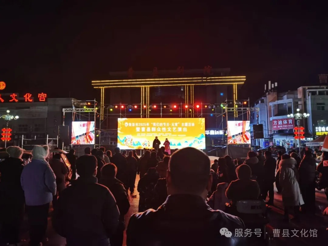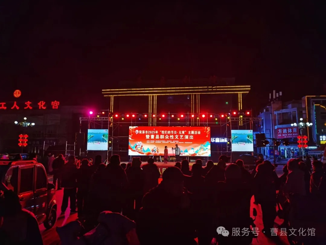 为了丰富群众的精神文化生活,营造喜庆祥和的节日氛围,2月11日至2月13日(农历正月十四至正月十六),由菏泽市文明办、菏泽市新时代文明实践服务中心、曹县县委宣传部、曹县文化和旅游局主办,曹县文化馆承办,曹县文化馆戏曲队、曹县戏剧家协会、曹县传统文化促进会、曹县一中老校友艺术团、曹县金秋中老年艺术团协办的2025年“我们的节日—元宵节”群众性艺术展演活动,在曹县南湖人民广场成功举办。