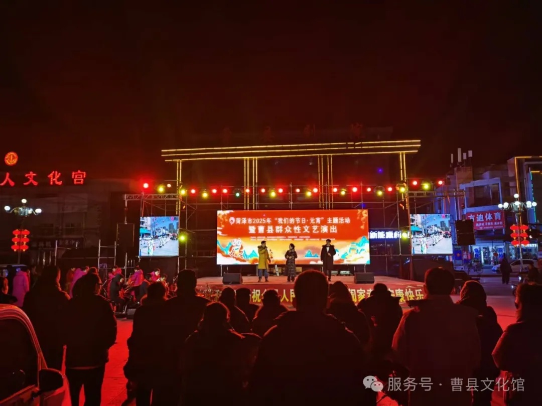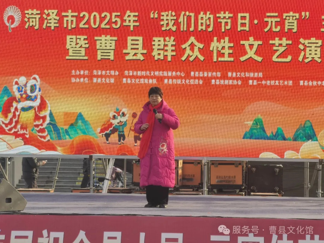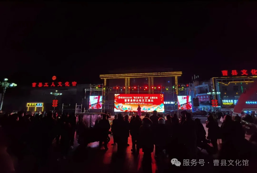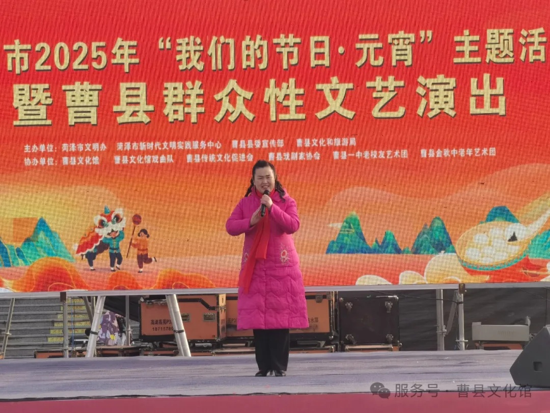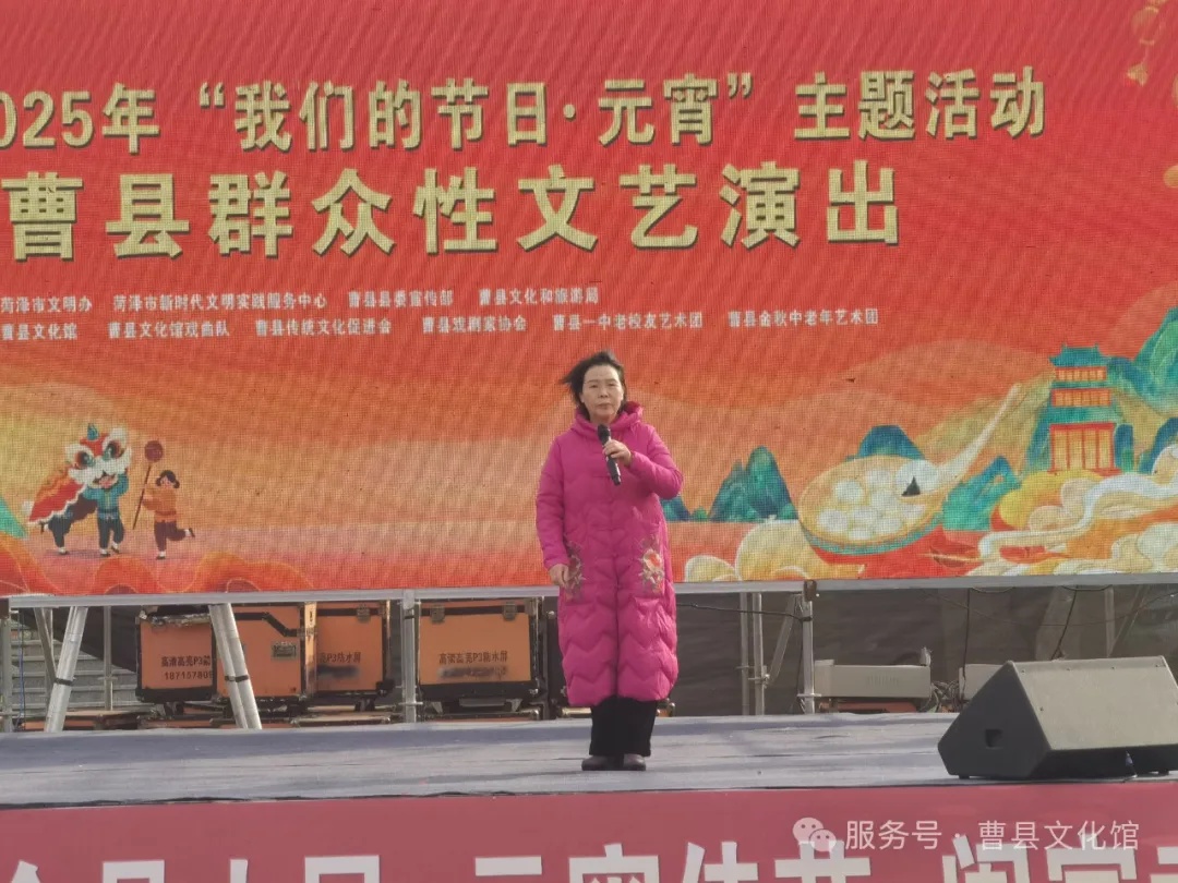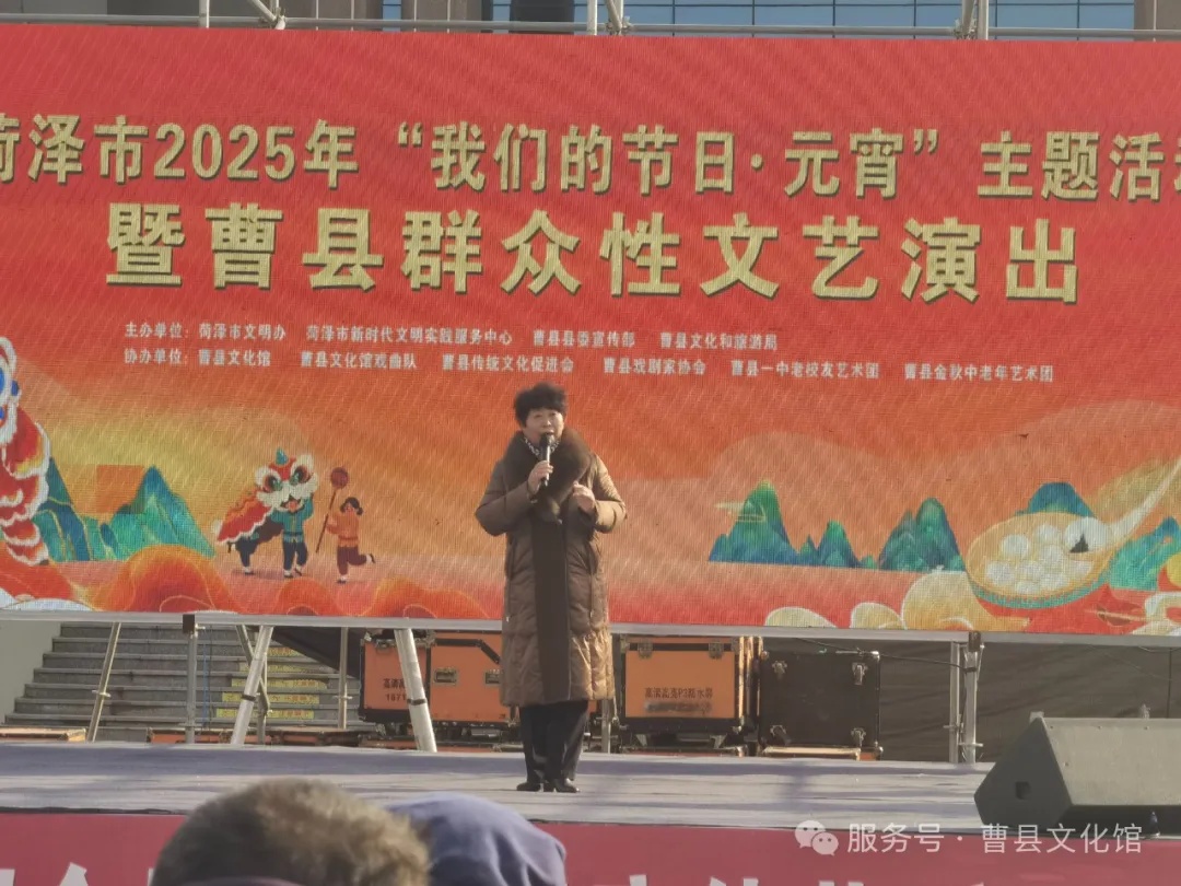 为了丰富群众的精神文化生活,营造喜庆祥和的节日氛围,2月11日至2月13日(农历正月十四至正月十六),由菏泽市文明办、菏泽市新时代文明实践服务中心、曹县县委宣传部、曹县文化和旅游局主办,曹县文化馆承办,曹县文化馆戏曲队、曹县戏剧家协会、曹县传统文化促进会、曹县一中老校友艺术团、曹县金秋中老年艺术团协办的2025年“我们的节日—元宵节”群众性艺术展演活动,在曹县南湖人民广场成功举办。