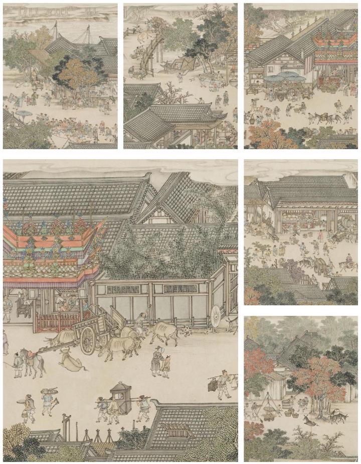 《金陵图》是描绘宋代南京城市风貌的清代宫廷写实风俗画长卷,高35厘米,长1050厘米。画卷从右至左大致可分为“乡野景致”“秦淮街市”和“郊野风光”三部分,既描绘了风光秀美的郊外景色,又展现了热闹非凡的城内生活。
