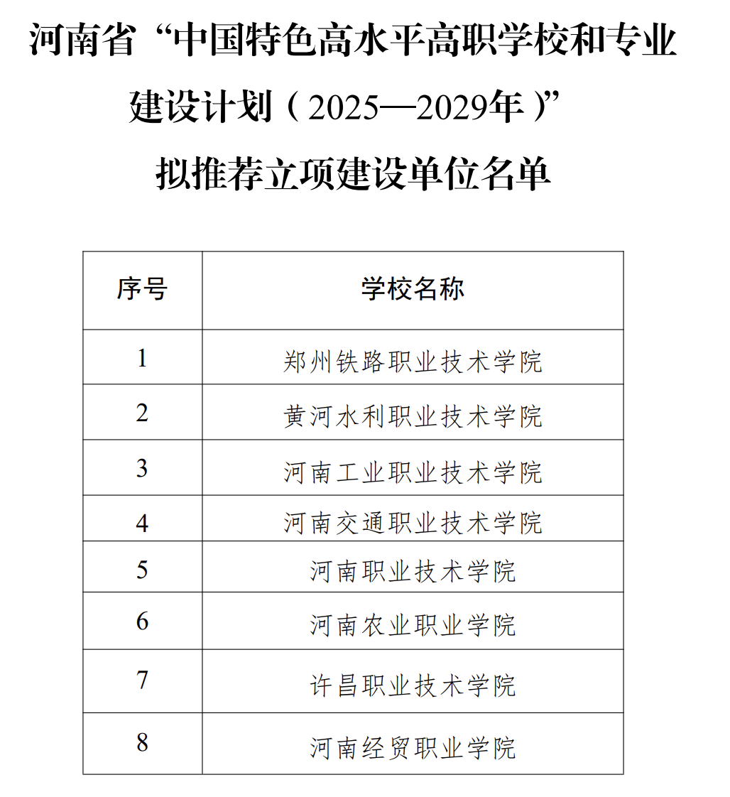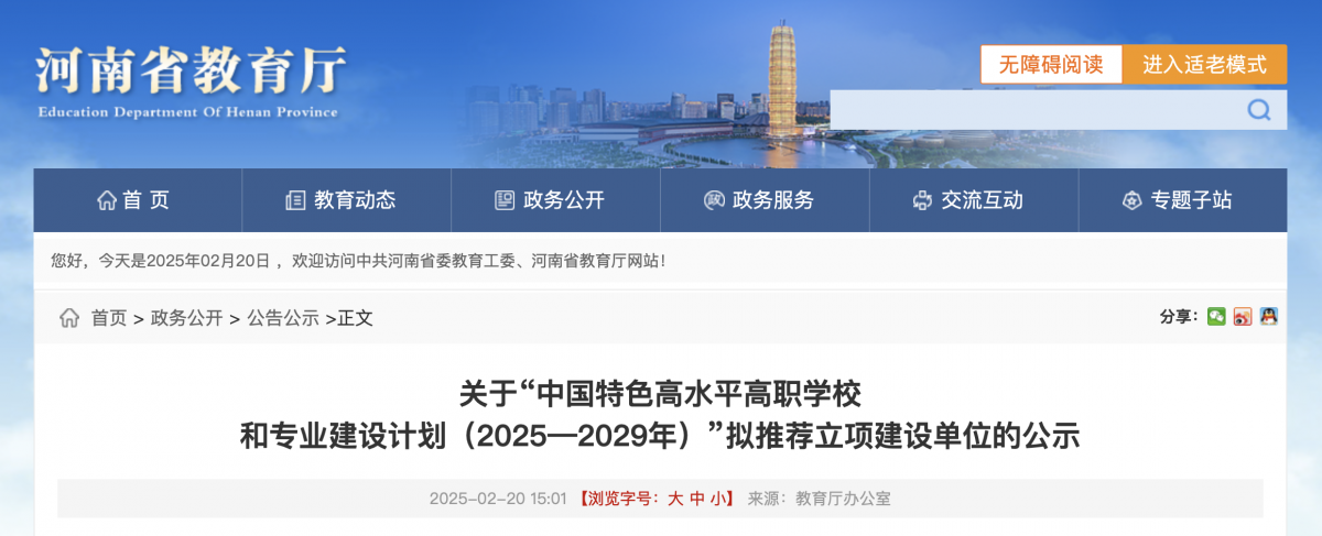 2月20日,河南省教育厅发布《关于“中国特色高水平高职学校和专业建设计划(2025—2029年)”拟推荐立项建设单位的公示》。