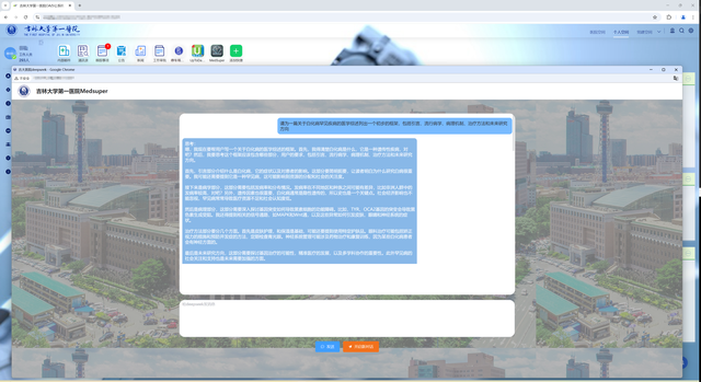吉大一院信息中心技术团队基于DeepSeek大语言模型和检索增强生成(RAG)技术,成功构建了覆盖诊疗规范、药物数据库和病例库的本地医疗知识库。通过向量检索技术,知识库能够高效索引海量医疗数据。当医生输入患者的症状和病史等信息后,系统可以迅速从多源数据中精准匹配相关信息,并利用大模型的生成能力,以结构化、易理解的方式呈现。在复杂病症诊断场景下,医生可借助系统快速查阅过往相似病例的诊疗过程与结果,同时结合最新的诊疗指南和药物相互作用分析,制定更科学、精准的治疗方案,从而提升临床决策的效率和准确性。