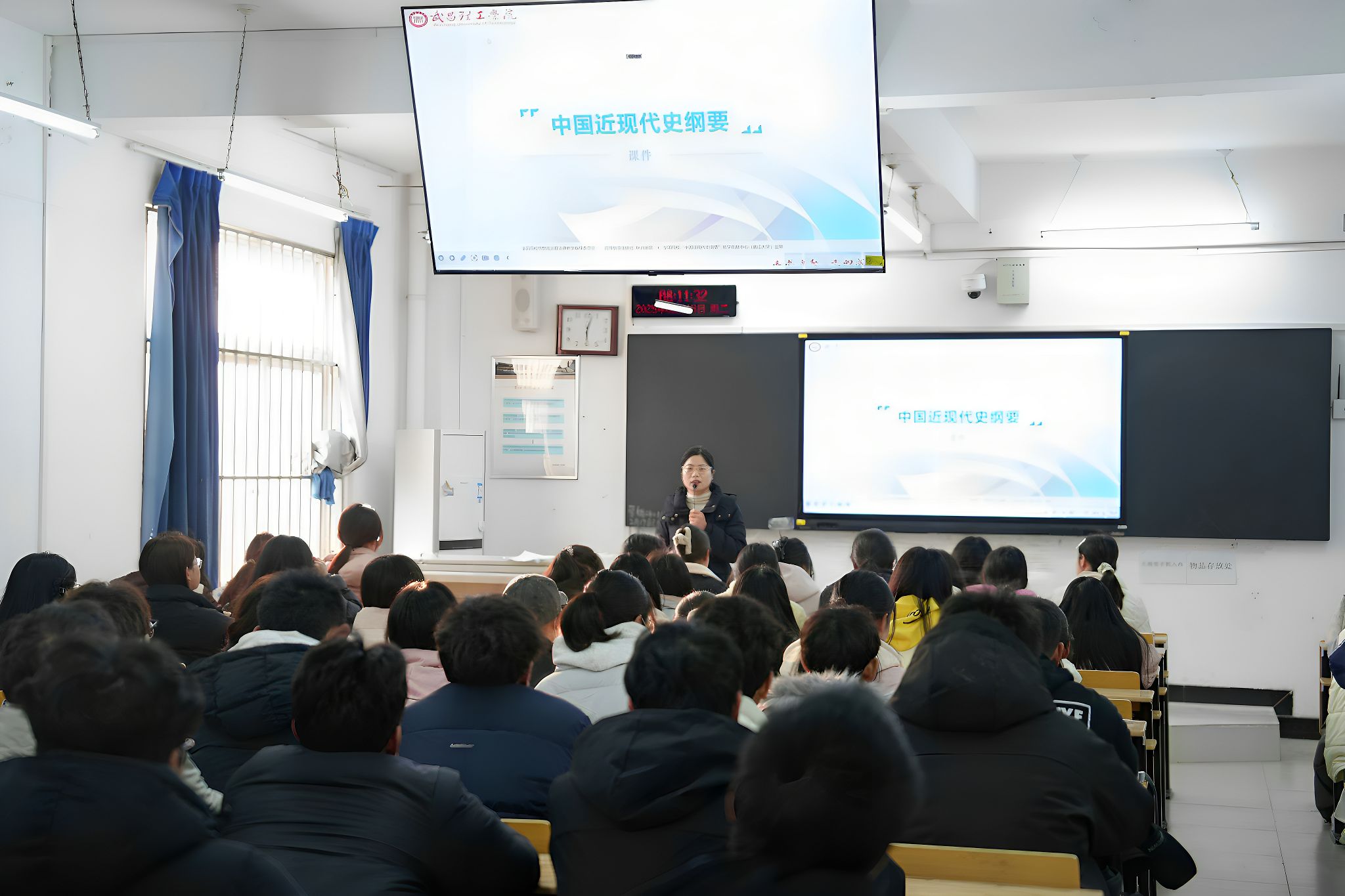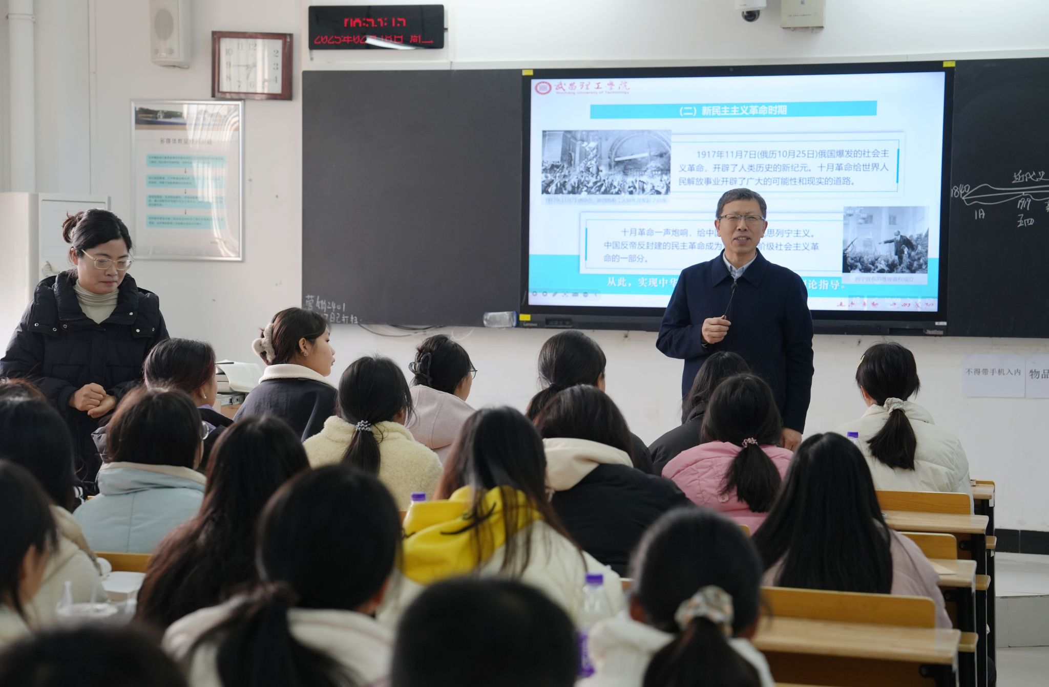 2月18日上午,武昌理工学院党委书记汪继平,校党委副书记、副校长林娟,常务副校长别业舫,校长助理、教务处处长王锋,校长助理、马克思主义学院院长彭贤则一行,在教学质量管理处处长陈义亭、学工处副处长杨云、马克思主义学院副院长曾晓辉等陪同下,来到商学院303教室,与投资学2401班、市场营销2401班的学生一起聆听了潘小丽老师讲的一堂《中国近现代史纲要》课。课上,校党委书记汪继平还走上讲台,用生动的语言和鲜活的案例,为学生们带来了一堂生动的思政课。