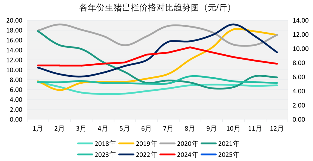 2025年1月国内生猪出栏价达7.85元/斤,月度环比下跌-0.44元/斤,市场供应偏强的态势持续存在,生猪市场行情呈现出缓慢下跌的走势。虽有大量补货需求,但供强需缓局面延续,生猪价格下跌。2025年1月生猪定点屠宰企业出栏价均价为17.57元/公斤,同比涨跌幅+14.37%,环比涨跌幅+0.16%。