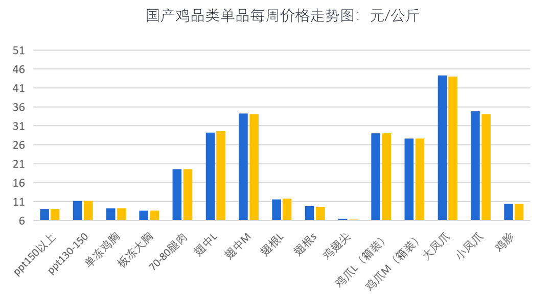 鸡产品周价格综合环比跌幅为-0.38%,月综合环比涨跌幅为-1.33%,整体行情较为稳定,主产腿类、胸类价格月内暂无变化。跌幅靠前单品有翅根S、翅尖;跌幅靠前单品有翅根S、鸡翅尖、鸡胗、鸡爪L等。