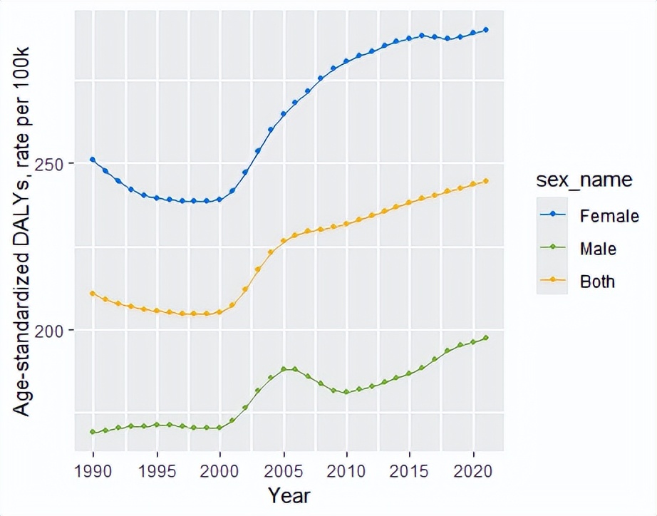 1990-2021年中国骨关节炎伤残调整寿命年疾病负担流行趋势