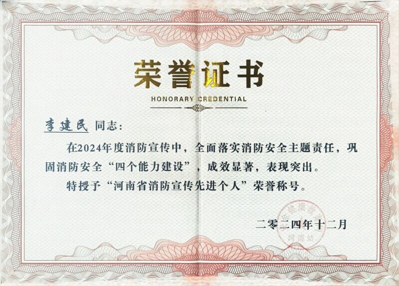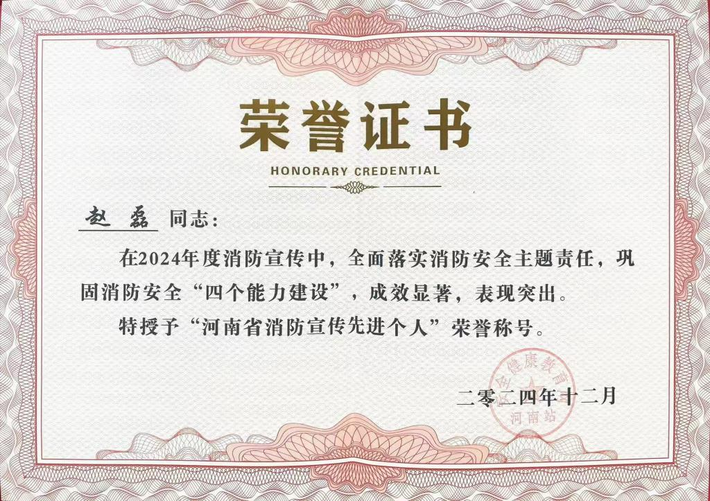 近日,中国安全健康教育网河南站对“2024年度消防宣传先进单位”进行了表彰,河南财政金融学院被授予“2024年度消防宣传先进单位”荣誉称号,保卫处副处长赵磊、消防科李建民被评为“河南省消防宣传先进个人”。